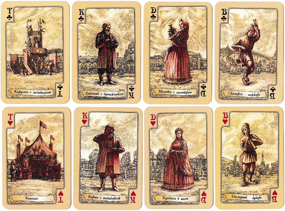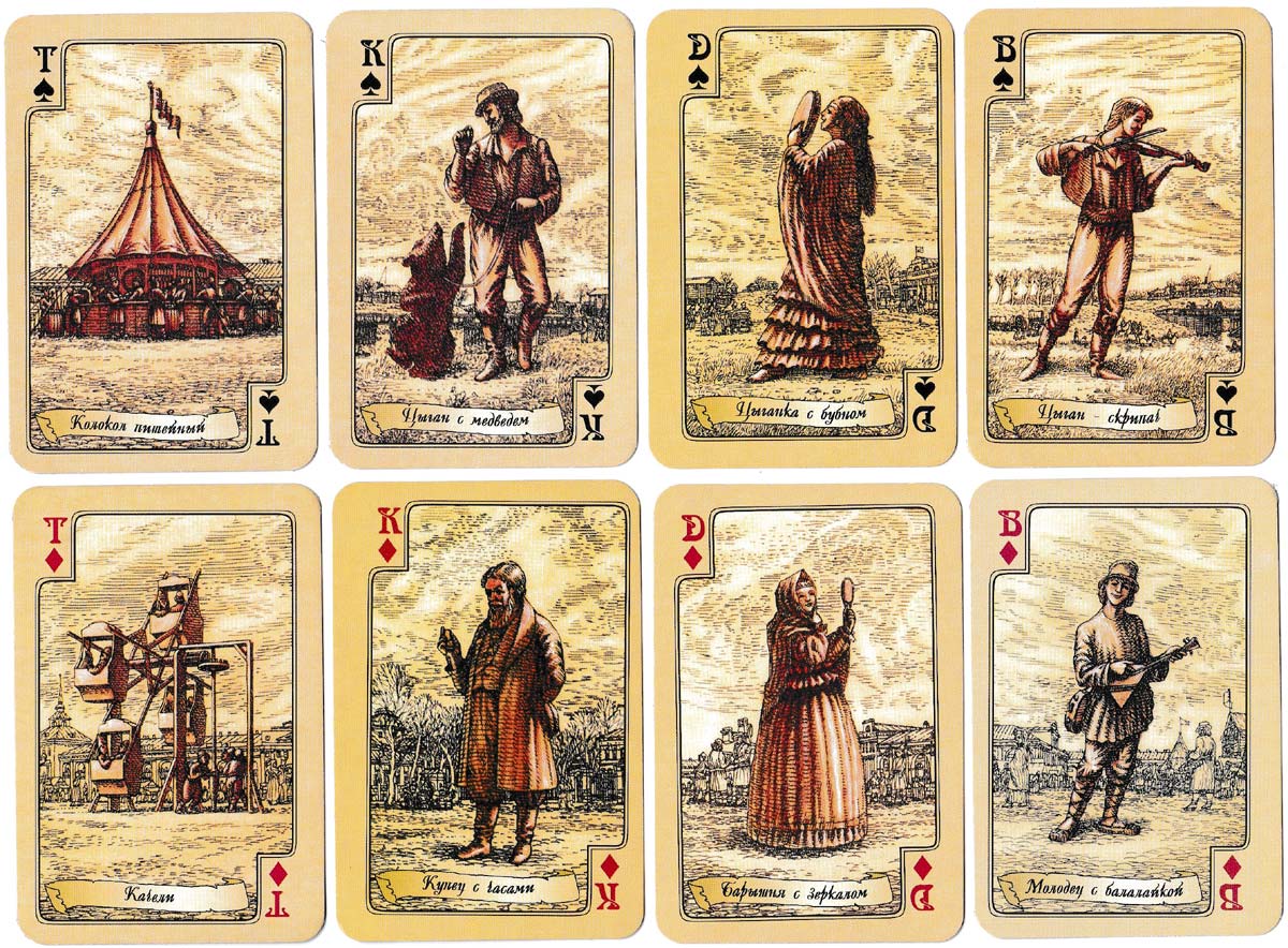 Another 36-card pack published by L. G. Kosheleva, Novosibirsk in 1997. The deck is unusual both in general and for this publisher, as L. G. Kosheleva primarily published fortune-telling cards. The deck contains graphically drawn characters from the fair, so beloved by all the inhabitants of Russia for hundreds of years. Characters depicted include a gypsy with violin; gypsy with a bear; young man with balalaika; a landowner with snuffbox; shopkeeper with pockerbook. The artist is Sergei A. Grebennikov (1960- ). The pip cards have ornate borders.
