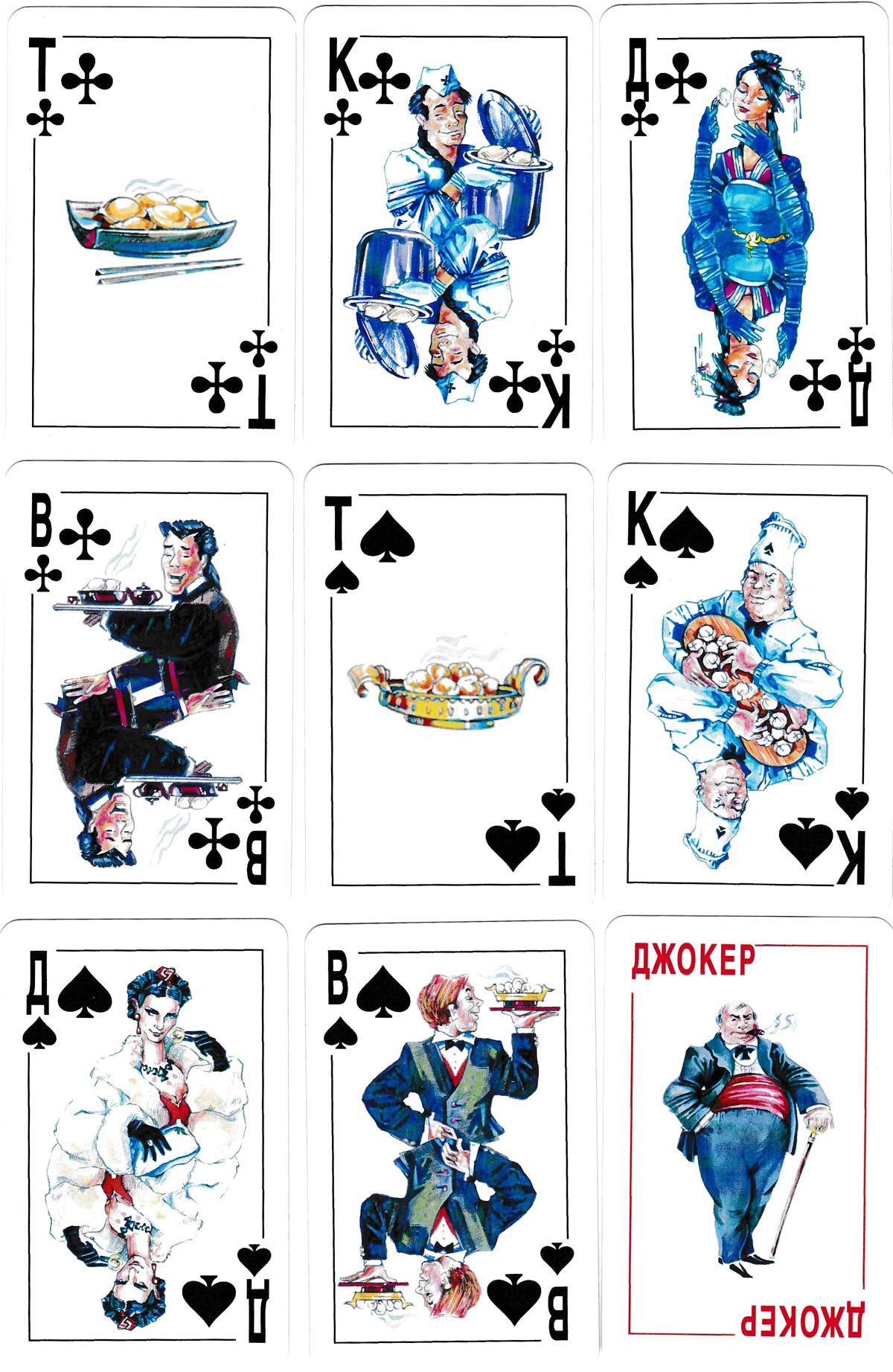 On the other hand, another meaning of this word is "Dude". It's slang and usually “it's being used for those dudes who don't deserve the bro's respect”. Whichever may be the case, this unusual pack was designed by Evgenia Alexandrovna Belyakova, (1980- ) who was born in Omsk and studied between 2001-2007 at the Repin State Academic Institute of Painting, Sculpture and Architecture, St. Petersburg. The aces portray plates, dishes or bowls of dumplings; the kings are the chefs; the queens are the well-to-do customers holding a dumpling, and the jacks are the waiters carrying the dishes to the tables. The pip cards have a centrally placed standard suit sign surrounded by the appropriate number of dumplings.