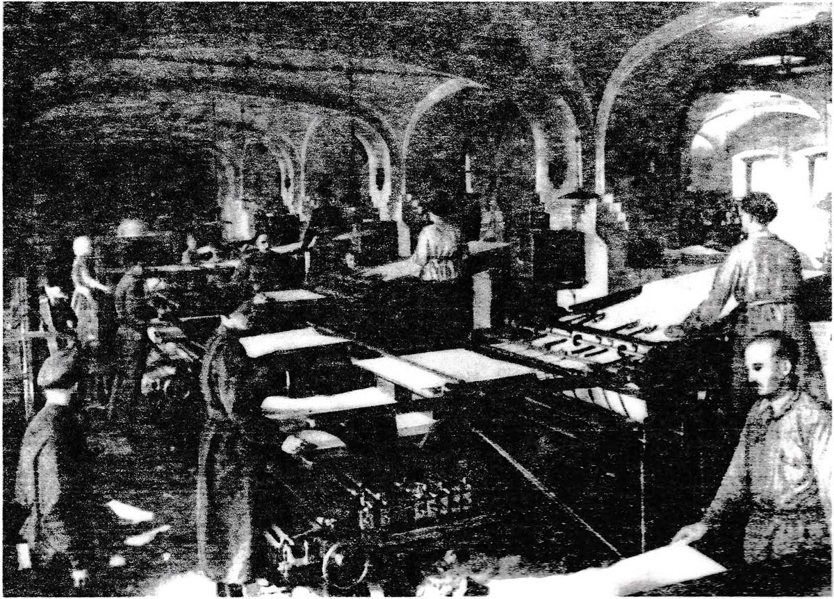 Above: workers in the printing room of the playing card factory, early 1920s. Poltora veka [3].