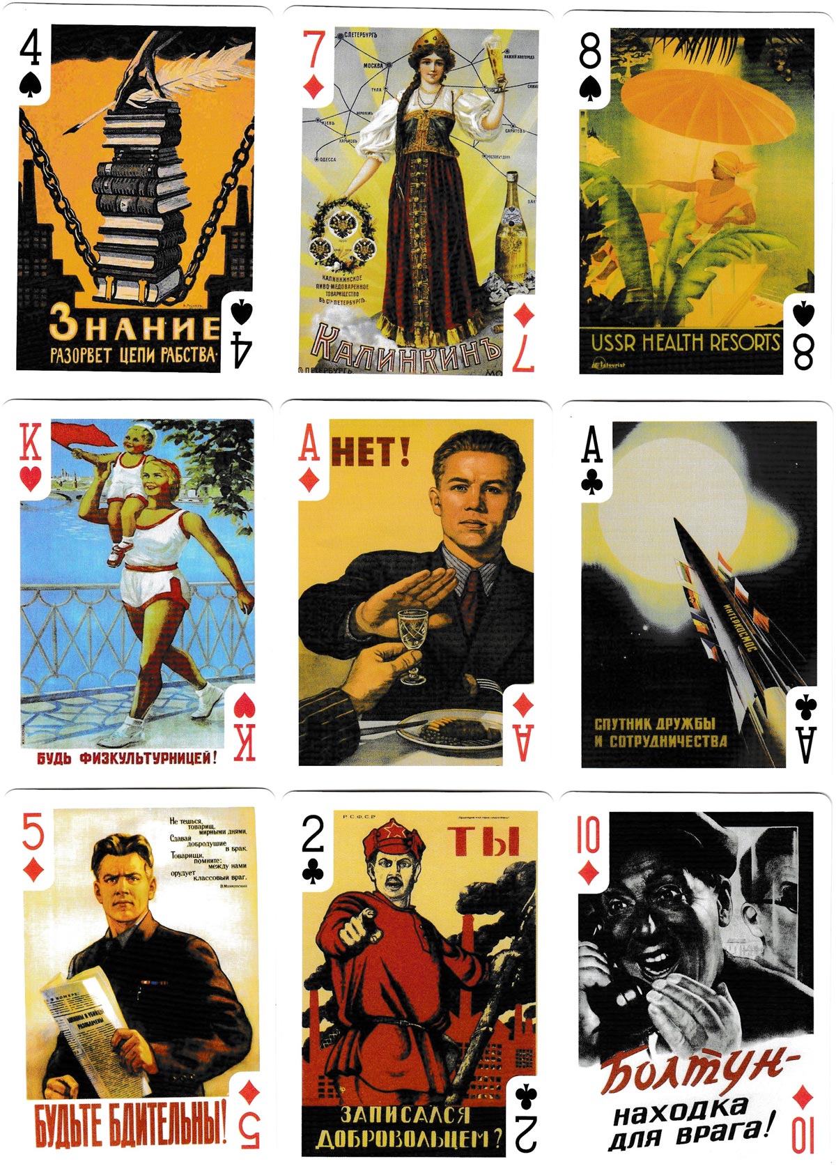 Above: Soviet propaganda poster playing cards, unknown publisher or date of production. 52 cards + 2 jokers in box.