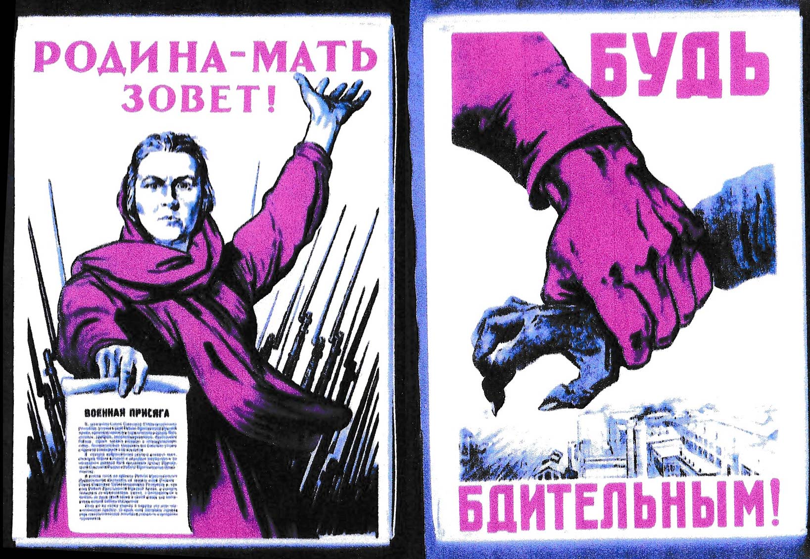 This 54-card pack reproduces some of the familiar poster images that appeared throughout the existence of the Soviet Union. Some images portray the social and personal benefits of Communism – health, fitness, reading, education; others were produced during the Great Patriotic War against fascism; some promote the Soviet values of labour; and some glorify the scientific and technical advances brought about through Communist rule, including space flight. There is no indication of either the publisher or date of production. The side of box reads “Soviet propaganda posters inside”. On the front: "The Motherland calls, holding the soldier's military oath of allegiance"; on the back of the box: "Be vigilant!"►