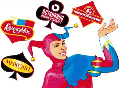This 54-card advertising pack, with Russian indices, was published by RusJoker, St Petersburg in 2005, in a limited edition of 250 copies. Each suit sign is embellished with the logo or trademark of one particular Russian manufacturer: the Mikoyan Russian Aircraft Corporation, a major Russian aerospace and defence company (spades); KampoMos, a leading Russian manufacturer of sausages (hearts); Cherkizovsky Market, Europe's largest marketplace, located in Moscow between early 1990s to 2009 (diamonds); and Ostankino novyi standart, a wholesaler of meat and meat products (clubs).