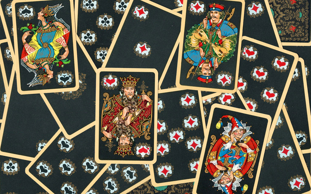 Above: “White Palekh” playing cards, modern edition published in 1995. A selection of alternative back designs are known. A “Palekh” miniature is a Russian folk handicraft of miniature painting, which is done with tempera paints on varnished articles made of papier-mâché (small boxes, cigarette and powder cases etc.)