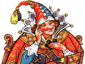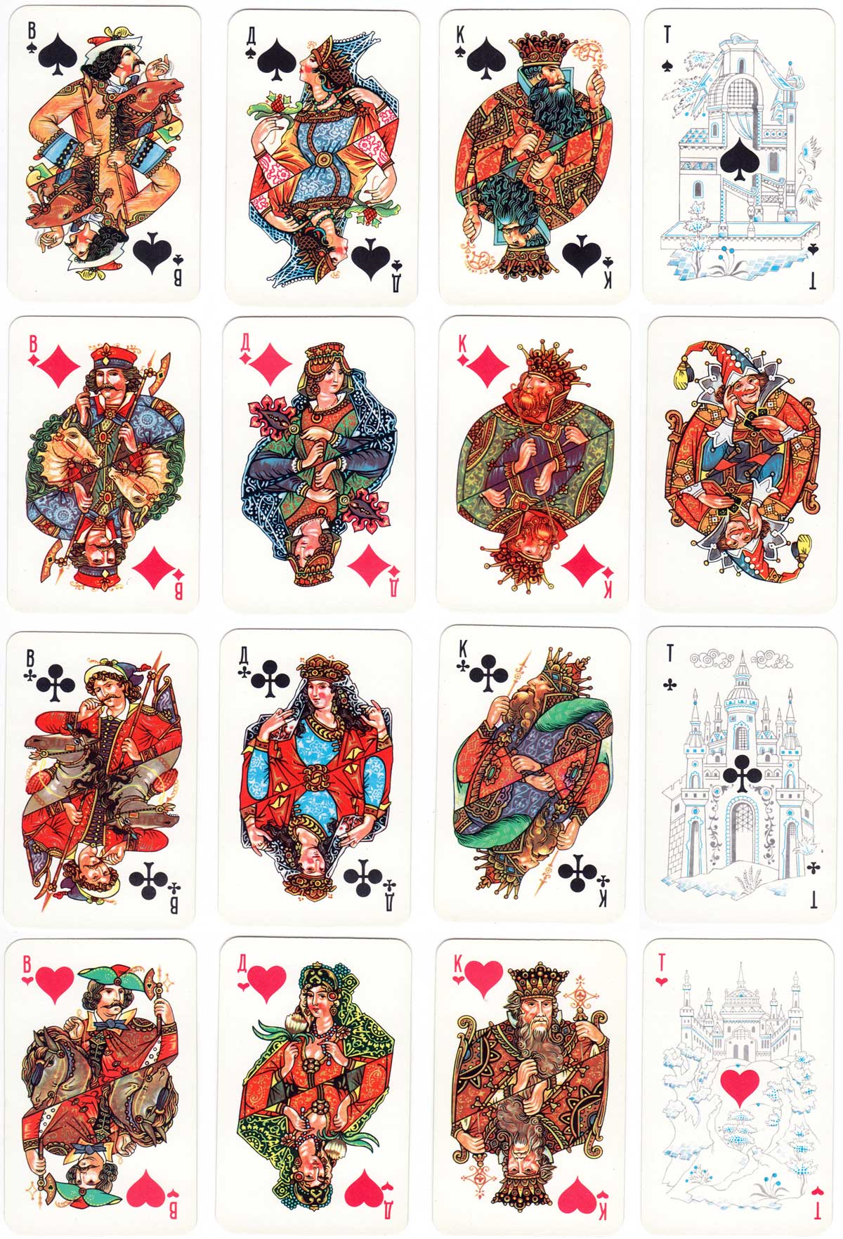 These brightly coloured and poetic designs by Pavel Bazhenov were first published by the the Colour Printing Plant (1817-2004) in St. Petersburg in 1937 as “Black Palekh”, with black backgrounds, for the World Exhibition in 1937, and reprinted in 1967 for the 150th anniversary of the Leningrad/St. Petersburg playing-card factory. The “White Palekh” (Palekh = miniature painting, lacquer art) version shown here was first issued in 1982. It has gold overprinting which does not show up well in scans. The four Jacks are depicted as horsemen.