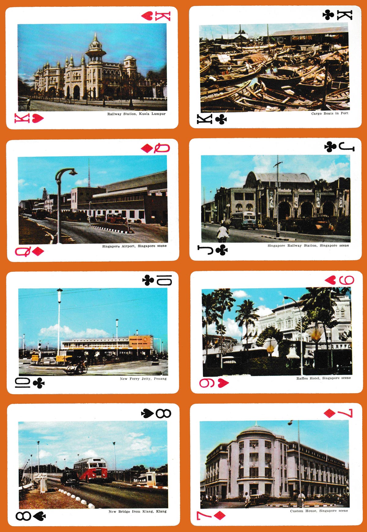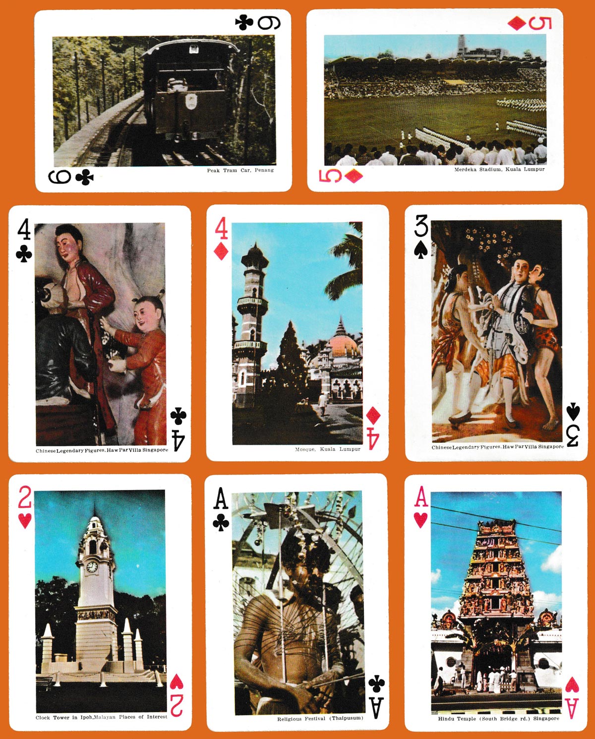 As the New Ferry Jetty, Penang (10 of Clubs), was built in the early 1960s and as Singapore, Malaya and Borneo (and Sarawak) joined to become Malaysia in 1963, this pack must date from about 1962. The 52 colour views are mainly in horizontal format and all have titles in English. The views include historic buildings, harbour views, festivals, and scenes from Chinese classical operas. See the box►