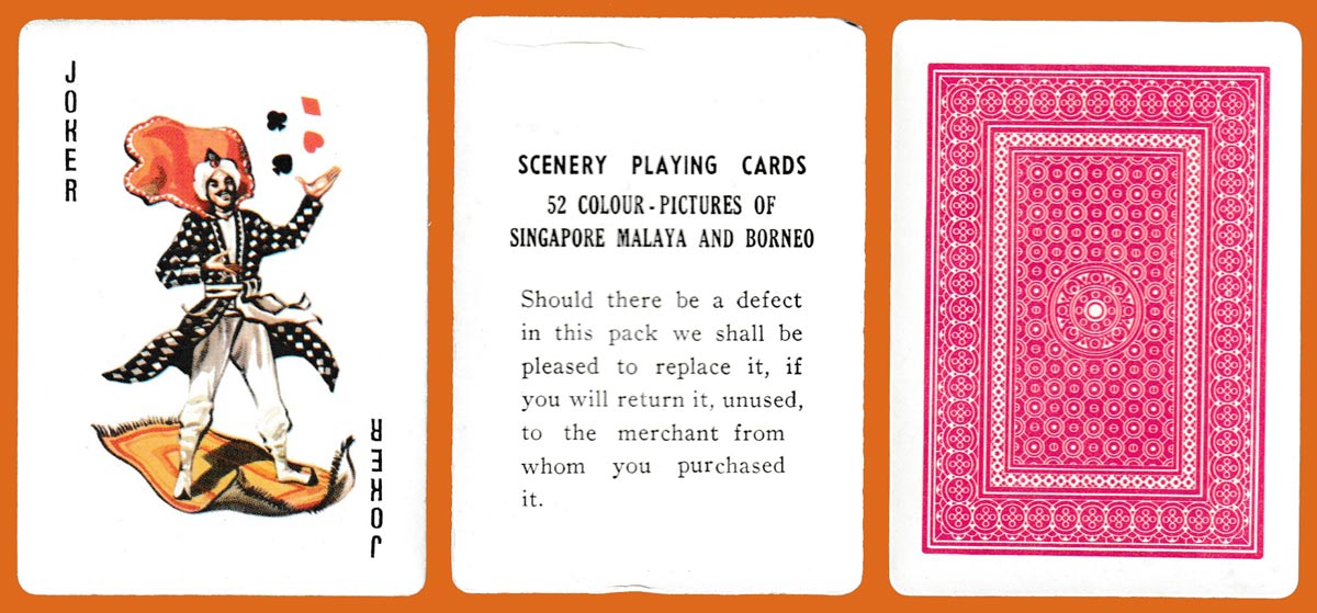 Above: ‘Souvenir of Singapore, Malaya and Borneo’, publisher unknown. Cards printed in Hong Kong, c1962. 52 cards + 1 Joker + 1 extra card in tuck box. Size: 61.5 x 86 mm.