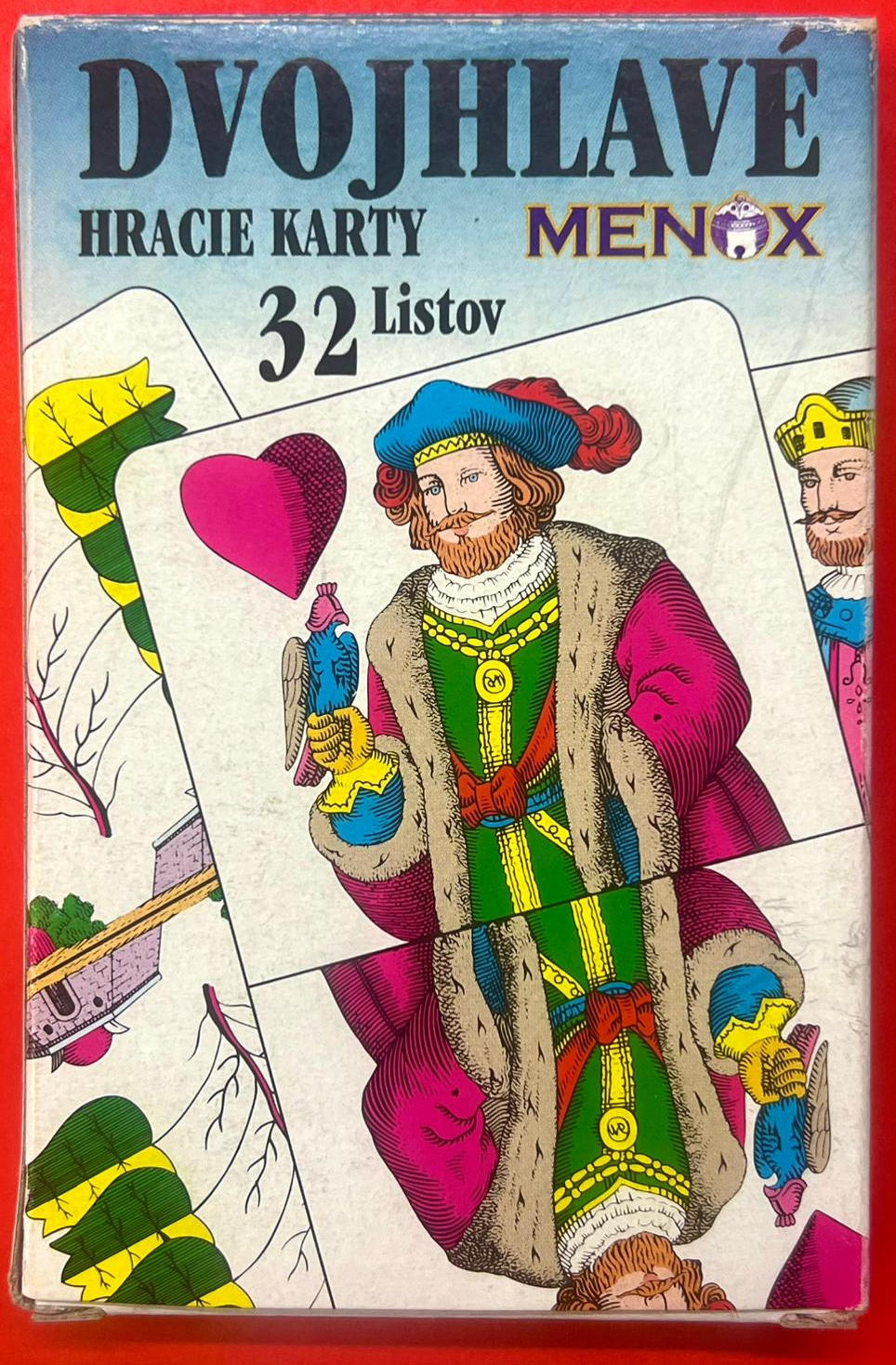 This 32-card double-headed deck with traditional German suits (Hearts, Acorns, Leaves and Bells) was produced by the Slovak playing card manufacturer Lauko Promotion s.r.o. The company continued the production and know-how of Menox CZ s.r.o., which it had acquired in 2011. Although the main offices and distribution are now located in the Czech Republic, production and sales remain in Slovakia.