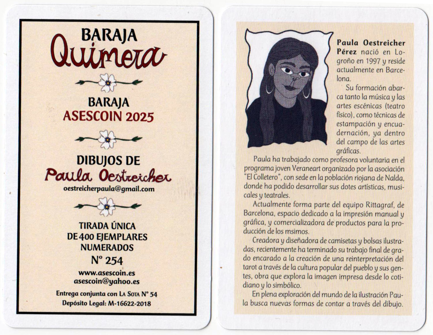 Above: Baraja Quimera designed by Paula Oestreicher and produced by Max Playing Cards for Asescoin (Madrid), 2025. 48 cards + 2 comodines (jokers) + several extra cards in a cardboard tuckbox. Limited edition of 400 numbered copies.