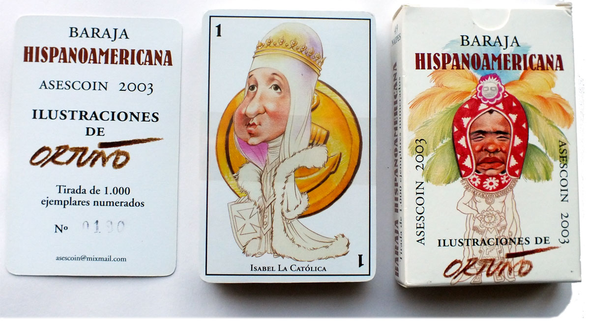 “Baraja Hispanoamericana” was published by Asescoin (Madrid), printed in Mexico by Productos Leo S.A. in a limited edition of 1000 numbered copies. The court cards, aces, jokers and number 4s depict caricatures of conquistadors and other persons associated with the discovery, colonisation and subsequent liberation of Hispanic America. The artwork is by Ortuño.