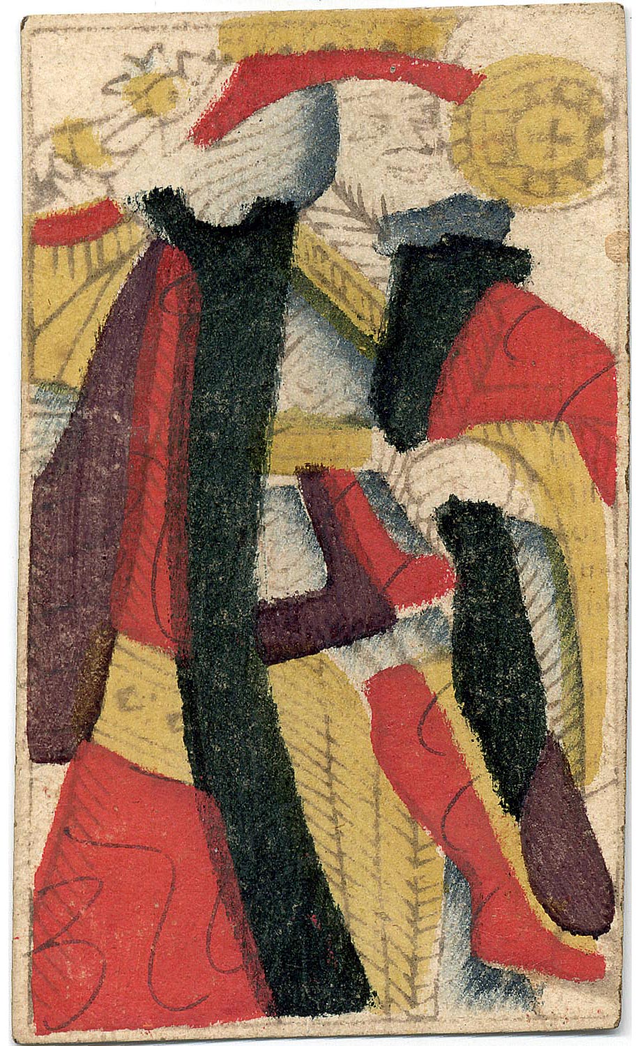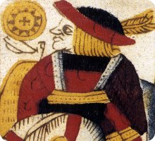 Cards from a Spanish-suited pack made by Phelippe Ayet, c. 1574 were found in the Torre de los Lujanes in Madrid during demolition, and are now in the collection of the Gabinete de Antiguedades Real Academia de la Historia, Madrid. 44 cards were found in total, derived from possibly three separate packs; approximate size: 11.5 x 8 cms. Opinion is divided over whether the cards were made in France, possibly Thiers, and imported into Spain, or else made in Catalonia by a French or Flemish card maker. The style is an archaic, late medieval type, which pre-dates the Spanish National pattern. The King of Coins wields a battle axe over his shoulder and can be found in later cards from Provence and also as the King of Hearts in English packs ('Suicide King'). The inscription on the Five of Coins reads: Grossus vs novvs imperatoris romanorum.