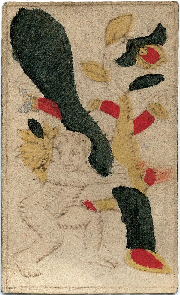 Above: cards from a woodblock and stencilled Spanish-suited pack, of similar design to the example by Phelippe Ayet, made by Jean Pouns S.S. (possibly of San Sebastian).