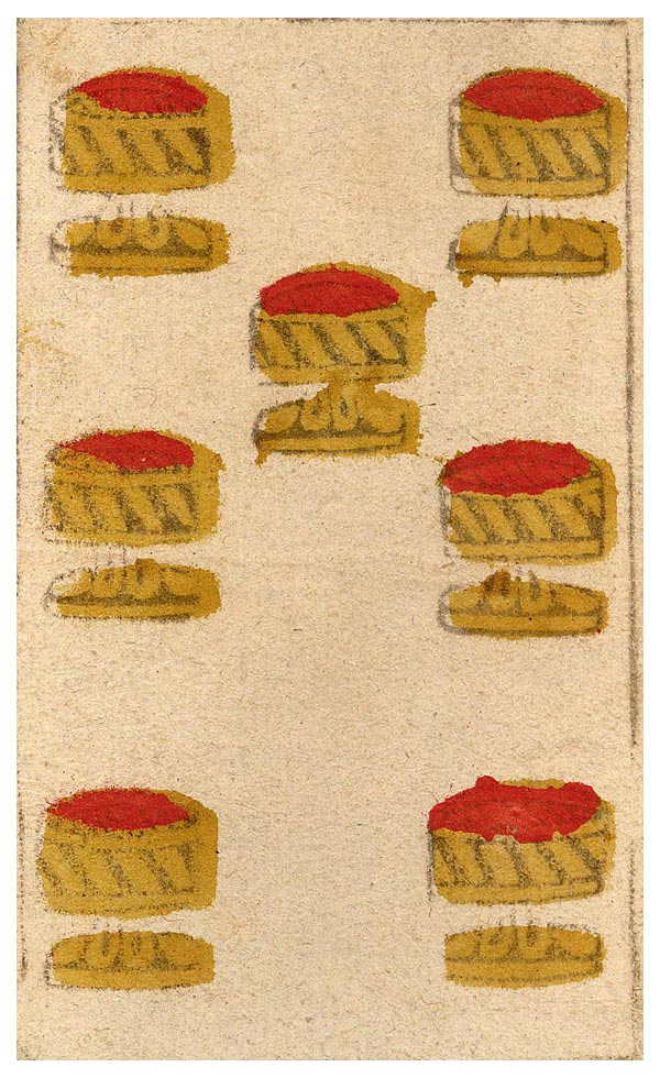 Above: the small figures on some of the numeral cards is a feature also seen in late XV century Catalan cards which persists into the sixteenth and seventeenth centuries in cards made in Seville. Cards with similar designs were produced by Jean Pouns (see below), Joan de Santillana and Jehan Prou. Another similar pack has been discovered in Toledo. Cards from facsimile edition by the Real Academia de la Historia, 2001.