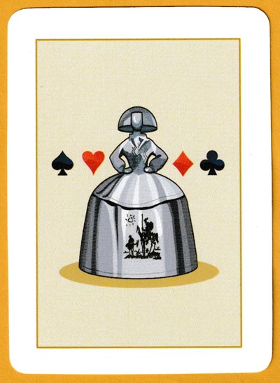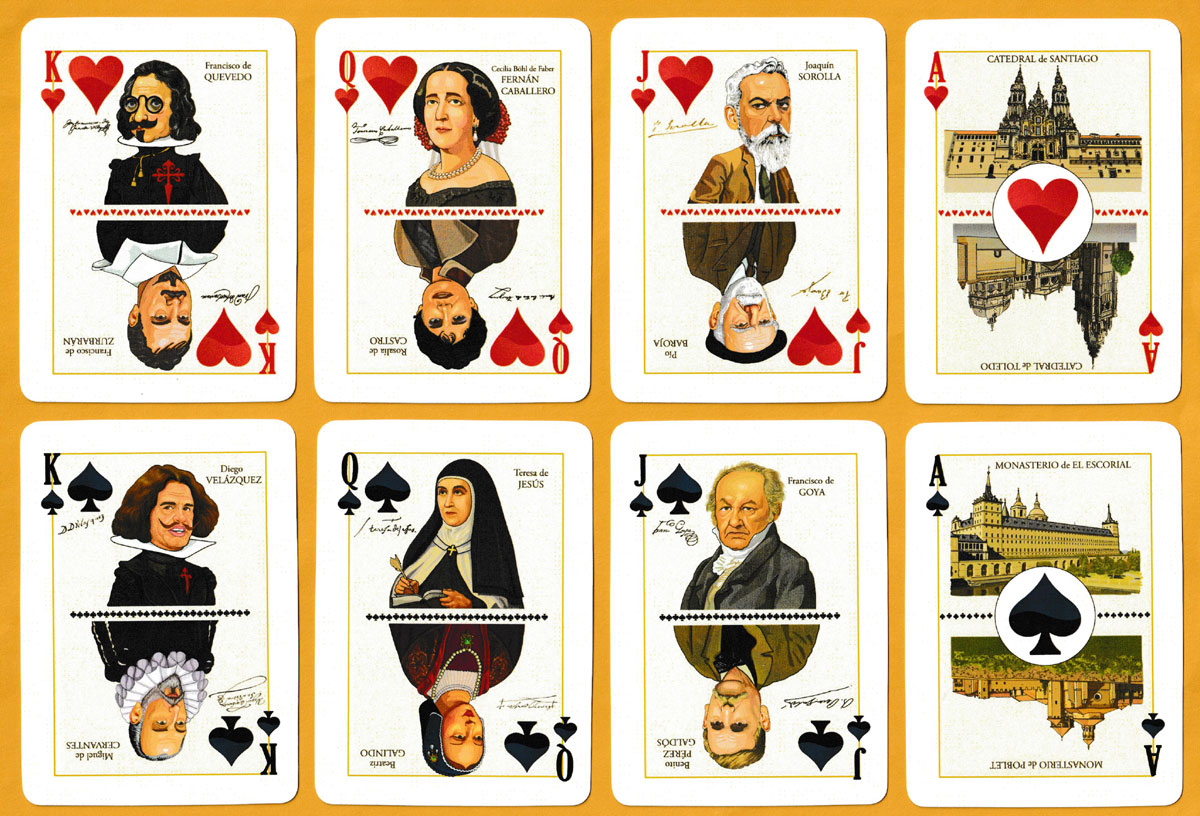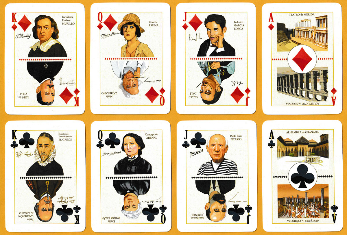 By depicting a different cultural celebrity at each end of every court card and three more on the Jokers, the artist Miguel A. Corella has managed to include 27 famous Spaniards from the fields of art, architecture, literature and music. These branches of culture are further celebrated on the 4s. Famous buildings can be found on the aces (double-ended) and 2s (single-ended). All the subjects are named. The pips consist of two shades of red or black (barely visible on the black suits). On the back there is a reference to Velázquez’ “Infanta Margarita Teresa in a Blue Dress” and also to Don Quixote by Cervantes. This was a numbered edition of 500 packs.