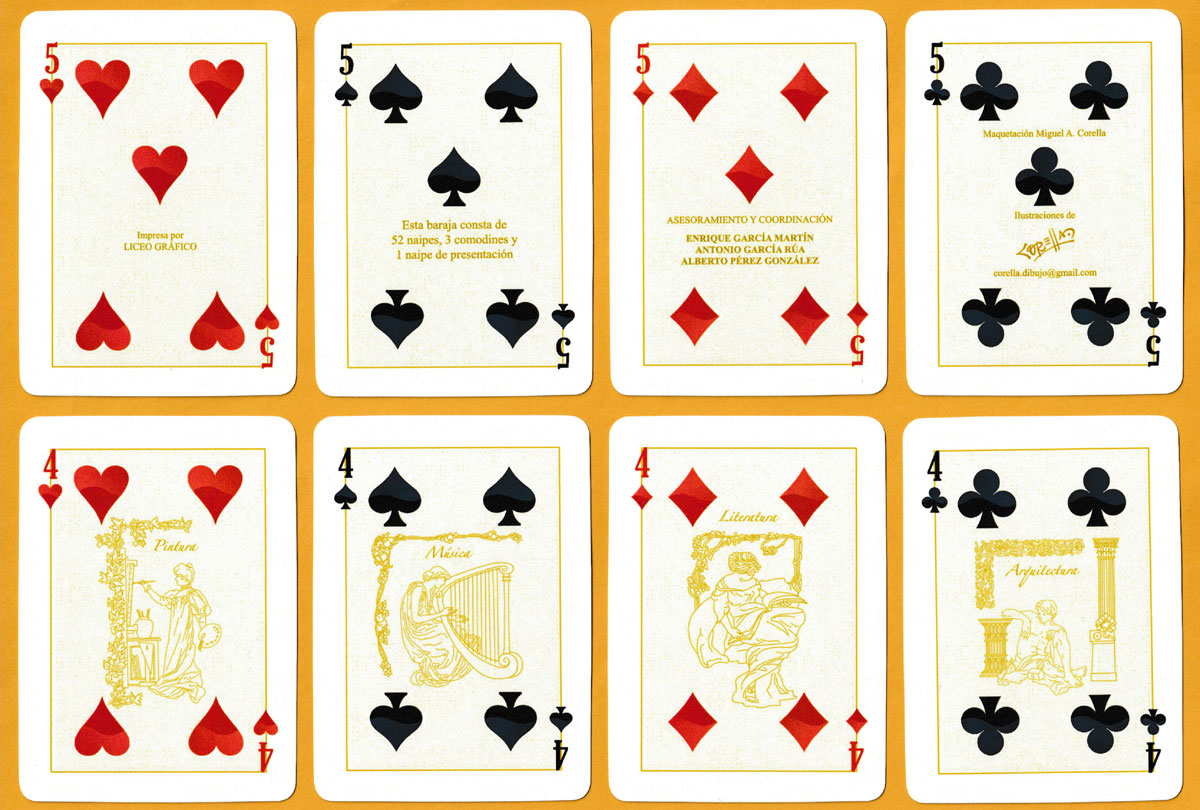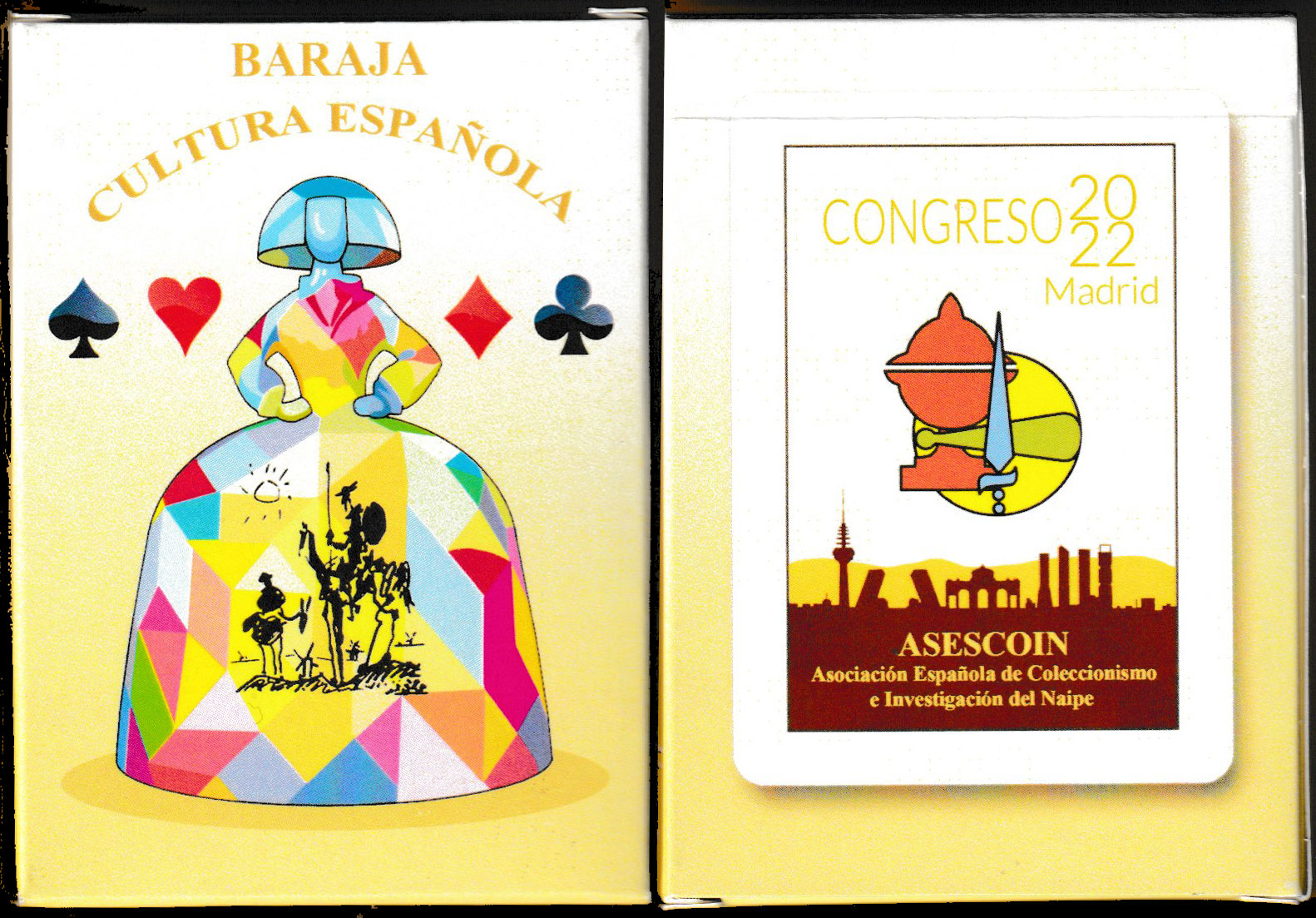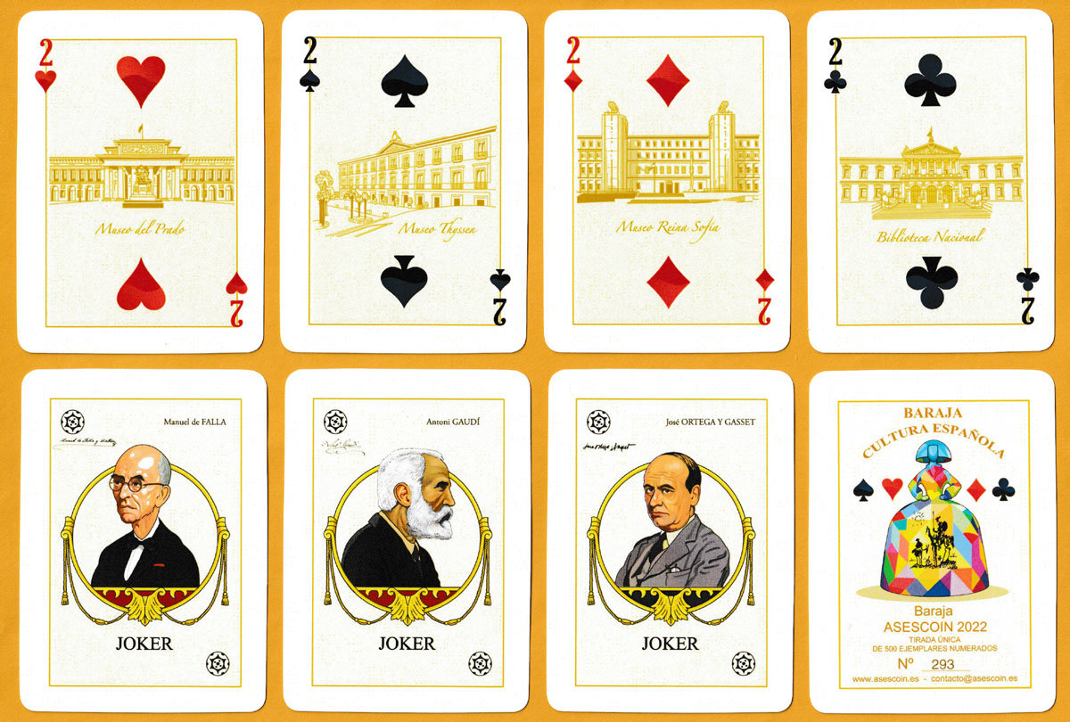 Above: Baraja Cultura Española printed by Liceo Gráfico, Armilla, for ASESCOIN, Spain, 2022. 52 cards + 3 Jokers + 1 title card in tuck box. Size: 63.5 x 88 mm. © ASESCOIN 2022