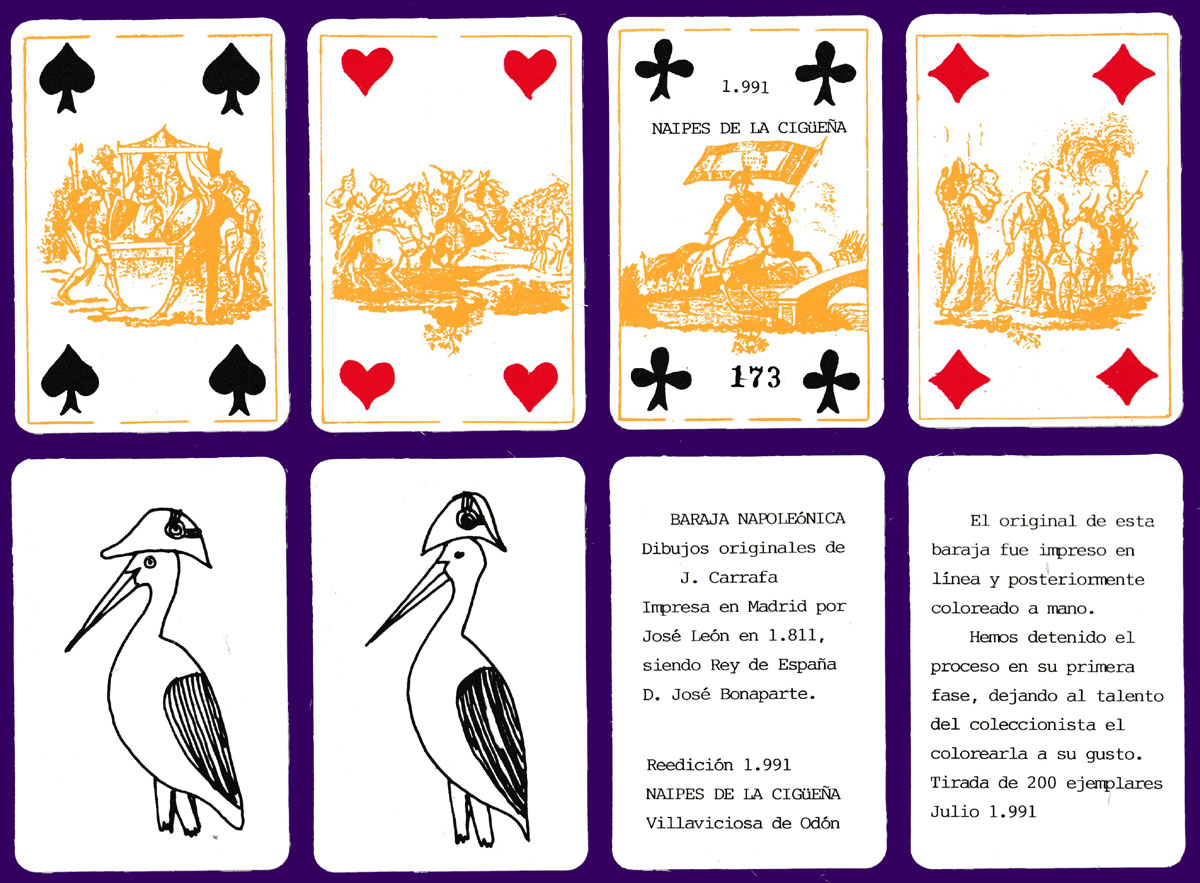 Above: Baraja Napoleónica published by Naipes de la Cigüeña, Villaviciosa de Odón, Spain, 1991. 52 cards + 2 ‘stork’ cards + 2 extra cards in tuck box. Size: 60 x 90 mm.