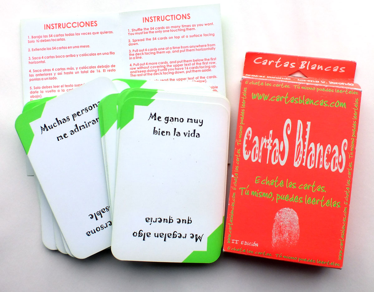 Cartas Blancas contain 54 cards plus instruction leaflet inside a sturdy box, and are available in Spanish or English versions.