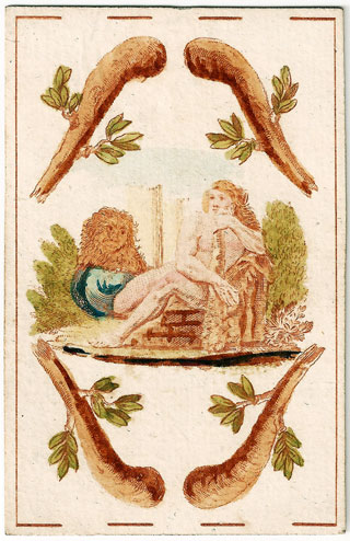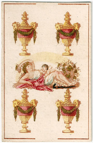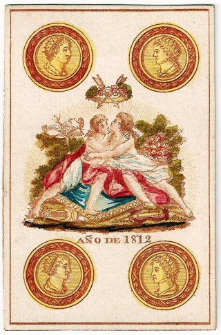 Cards from a deck etched on copper by José Martínez de Castro and first published by Clemente Roxas in Madrid in 1810. This example is from the second (censored) edition of 1812, in which extra drapery has been added to the miniature nude figures. Similar designs were used in the 1850s by Manuel Bertschinger y Codina and Sebastian Comas y Ricart, both from Barcelona. The designs have also been copied by Italian cardmakers in the 20th century. A facsimile was published by Heraclio Fournier (Vitoria, Spain) in 1977, titled Baraja Neoclasica. The most noteworthy feature of its history is that this design has since been adopted for use in Sardinia, where it is now regarded as the standard local pattern. Allowing for the limitations of present-day production methods, the Sardinian pack follows the Roxas original quite closely. |