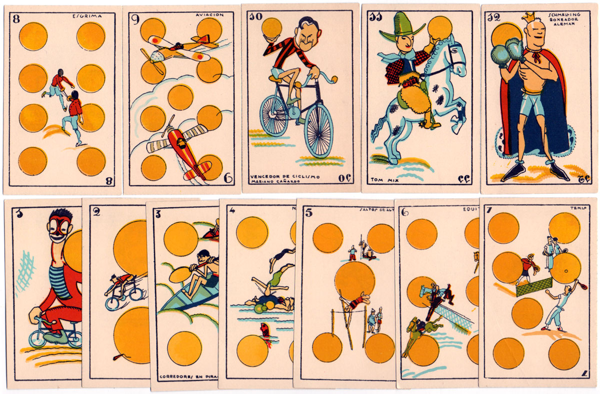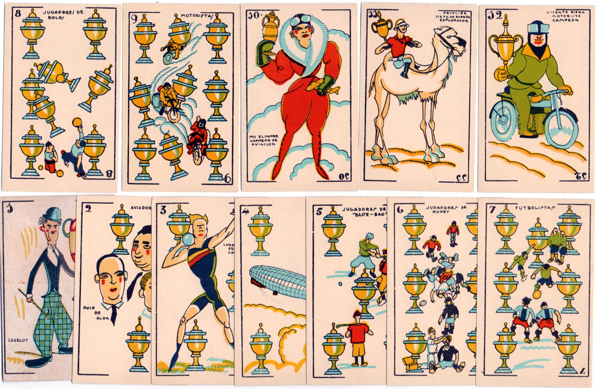 This cinema-themed pack from Spain captures the flavour of the era with artwork in an art-deco style. The card faces feature film personalities and also other contemporary champions from the worlds of sport and aviation on the court cards and in amongst the number pips. The backs, however, contain forty-eight numbered frames depicting Periquito (Felix the Cat) which make an animated ‘flick-book’ or elementary moving picture and link the pack to cinematographic history.