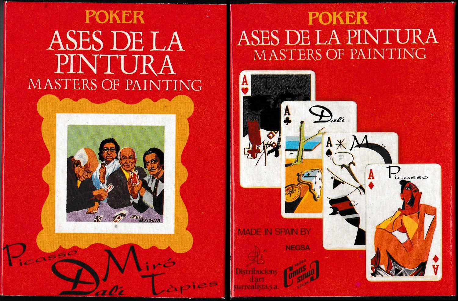 This attractive pack made by Naipes Comas, c.1990, celebrates four of the great Spanish painters of 20th century Spain: Picasso, Miró, Dalí, and Tapies. A famous painting by each of these artists has been selected, and original pips in the four suits have been constructed from an element within the painting. The artists/paintings are as follows: