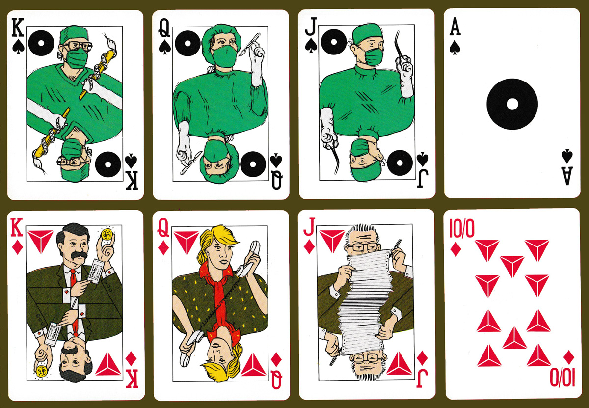 Each set of courts represents a different profession linked in some way to B. Braun-Dexon’s products and has a distinctive colour: doctors – green (S); salespeople – olive-green (D); pharmacologists – pale turquoise (C); the Red Cross – turquoise (H). A surgeon is shown on the Joker in black and white along with examples of the four non-standard suit-signs. One curious feature (which this reviewer can’t explain) is that the 10s to 2s are all followed by a slash (/) and a ‘0’. On the reverse, the name of the company, B. Braun-Dexon, is repeated many times in diagonal lines against a grey background.
