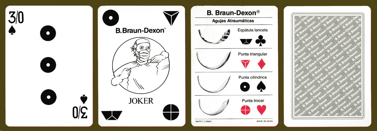 Above: pack promoting B. Braun-Dexon’s atraumatic needles made by Naipes Comas, Barcelona, Spain, 1986. 52 cards + 2 (identical) Jokers + 1 extra card in tuck box. Size: 63 x 88 mm.