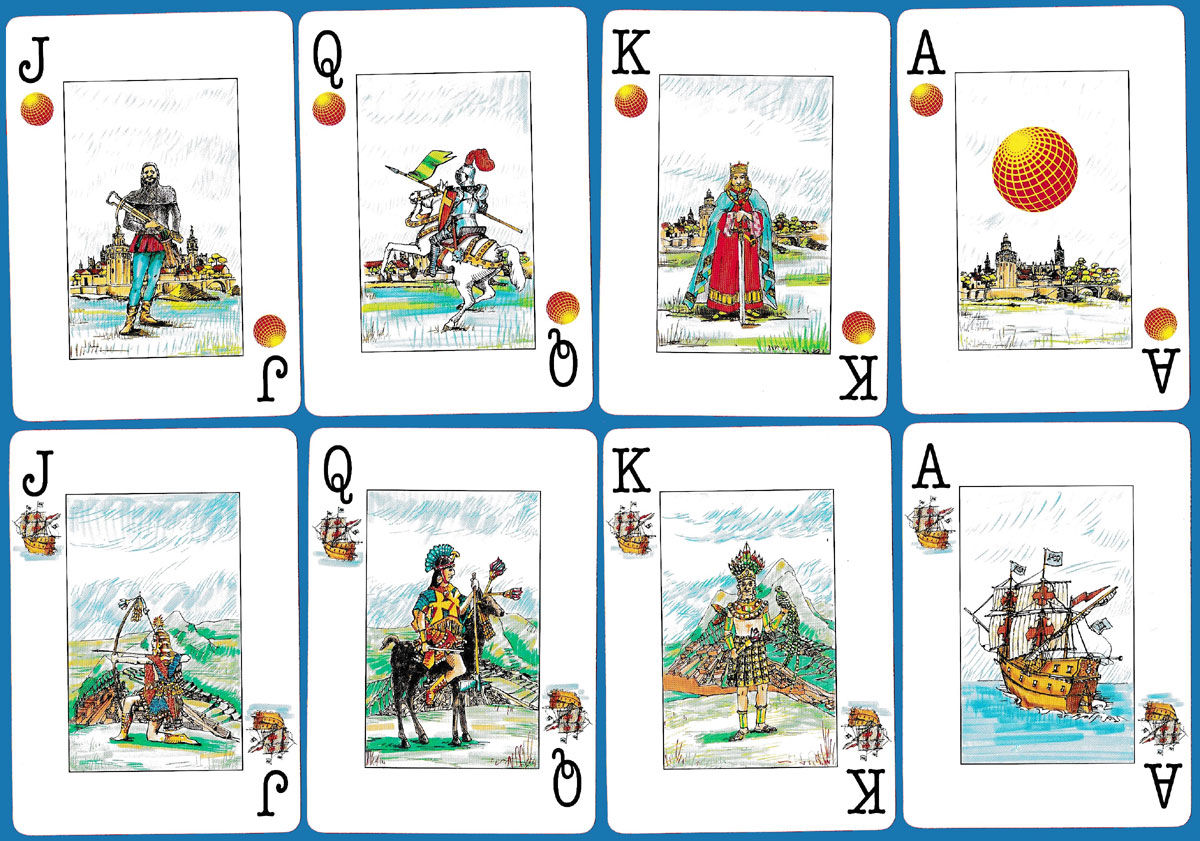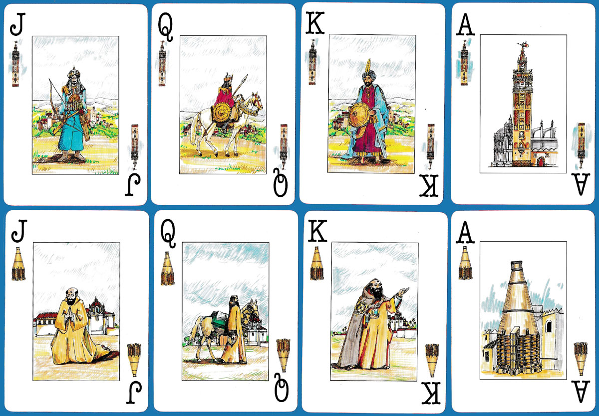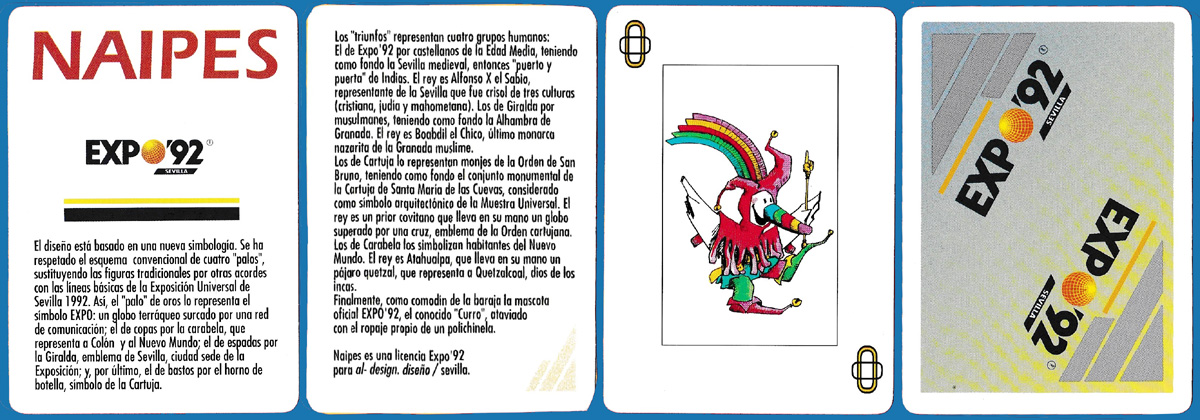 The court cards represent different groups: coins - Medieval Castilians; caravel - inhabitants of the new world; Giralda - Muslims; bottle oven / cartuja – Monks. The jokers are the strange "Curro" mascot of the Exhibition. This has the shape of a big white bird with the legs of an elephant, whose long conical beak and crest had the colours of the rainbow. See more details►