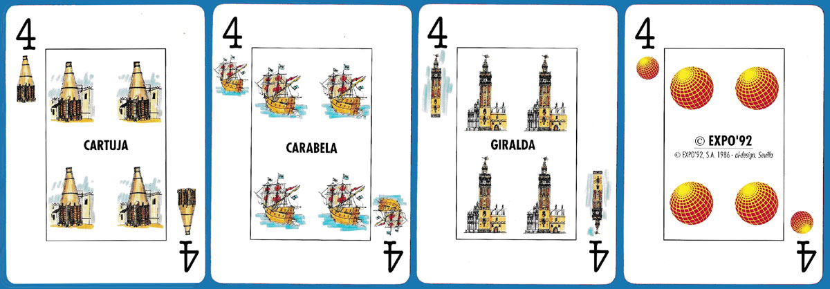 In this souvenir pack the suit of coins is represented by the symbol of the Expo, a globe crossed by a net, the suit of cups is represented by a caravel (a light sailing ship of the 15th, 16th, and 17th centuries in Europe), the suit of swords is the Giralda, a symbol of Seville, and the suit of clubs is a bottle oven, a symbol of La Cartuja or Charterhouse ceramic factory that once stood in the grounds of the Carthusian Monastery of Santa Maria de las Cuevas on the Isla de La Cartuja.
