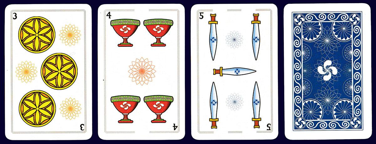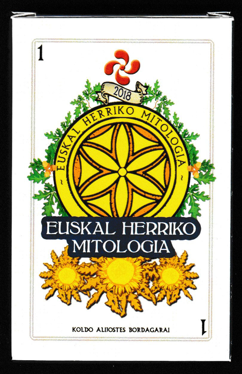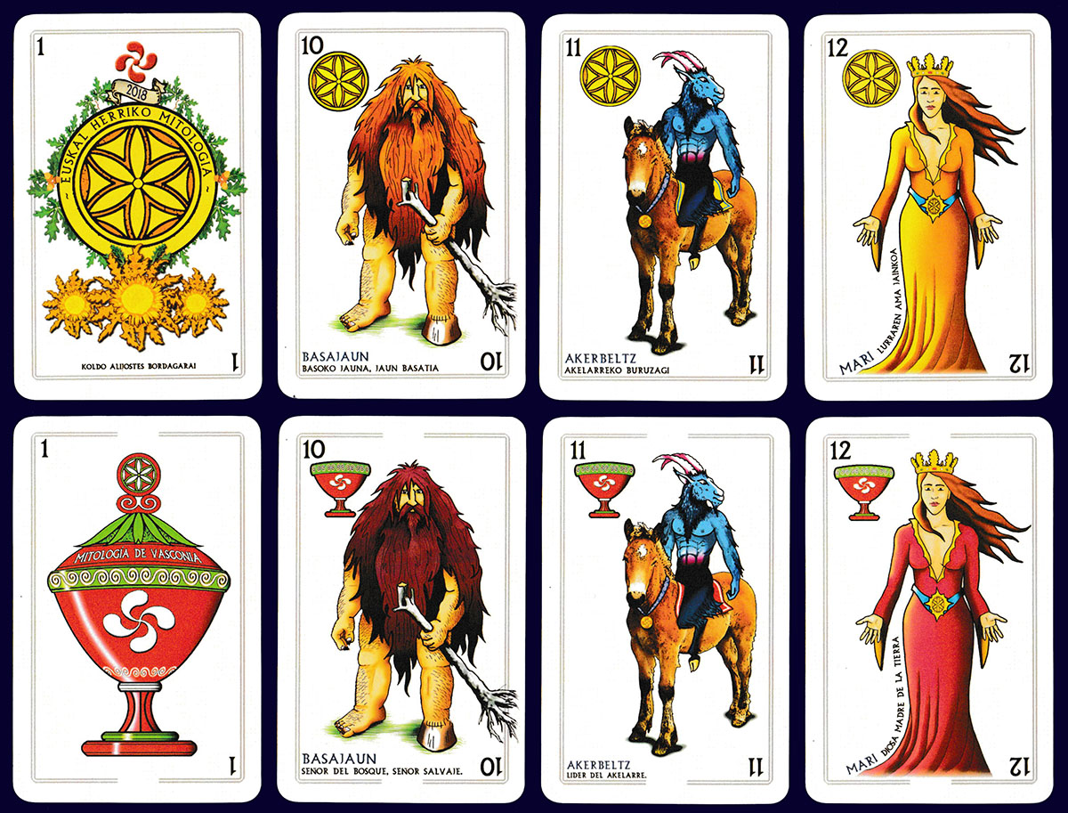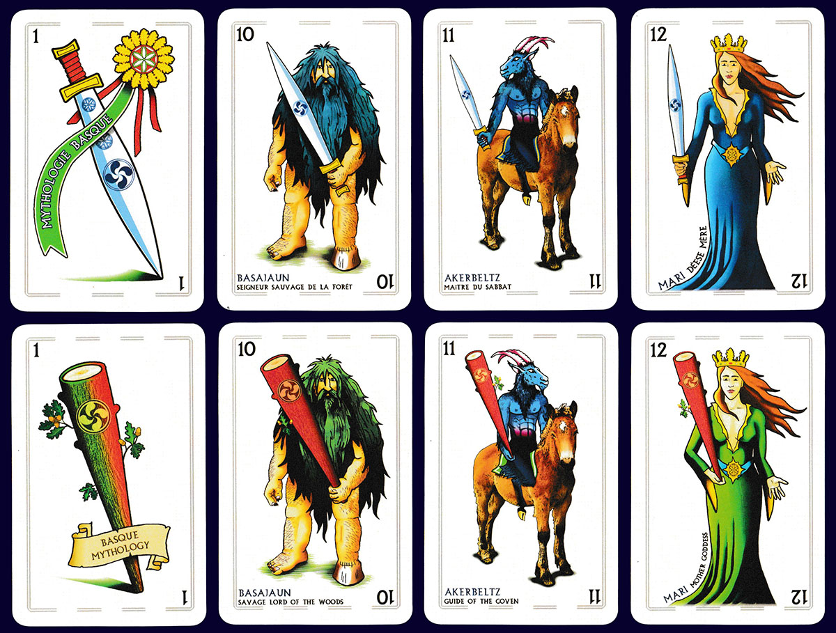 Three important figures from Basque mythology are featured on the court cards of this pack. Mari (12) is the goddess of the hearth who lives underground. Akerbeltz (11) has the appearance of a black billy goat and is the protector of domestic animals. Basajaun (10) is the lord of the woods, appearing as a large hairy man. There are minor differences in the look of these characters in each suit (different hair or dress colour, different pose, etc.), partly in order to accommodate the appropriate suit-sign. The well-known Basque symbol – the lauburu, representing a four-headed cross – appears throughout, both front and back. Each suit includes the title of the pack and the names of the characters in a different language: Basque (coins), Spanish (cups), French (swords), and English (batons). The back design is reproduced on the back of the box. See the box