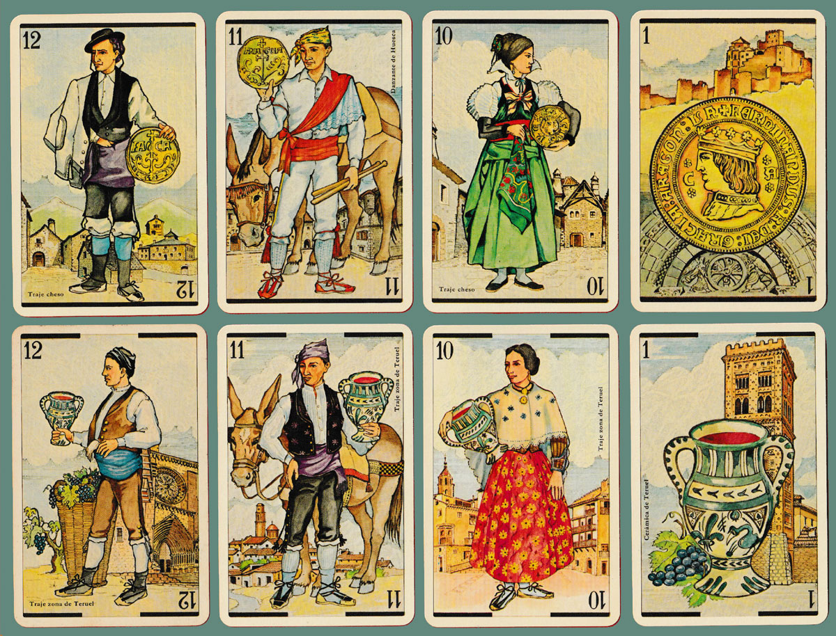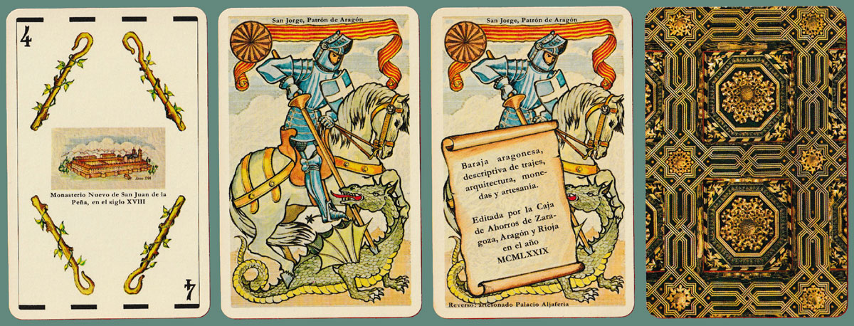 Aragon is an autonomous community comprising three provinces – Huesca, Zaragoza, and Teruel. Its capital is Zaragoza. This very attractive Spanish-suited pack combines traditional Aragonese costumes on the court cards with old coins on the suit of Coins, two-handled ceramic vases from Teruel on the suit of Cups, knives from Sástago on the suit of Swords, and shepherd’s crooks on the suit of Batons. In addition, there are vignettes (mainly of monasteries) on the 4s. All the images are discreetly named. The designer’s name, Raúl Rodriguez Segurado, appears on the 6 of Coins. There are two extra cards depicting St George, patron saint of Aragon, fighting the dragon. These extra cards could be used as Jokers. On the reverse there is a detail from a coffered ceiling in the Palacio Aljaferia in Zaragoza.