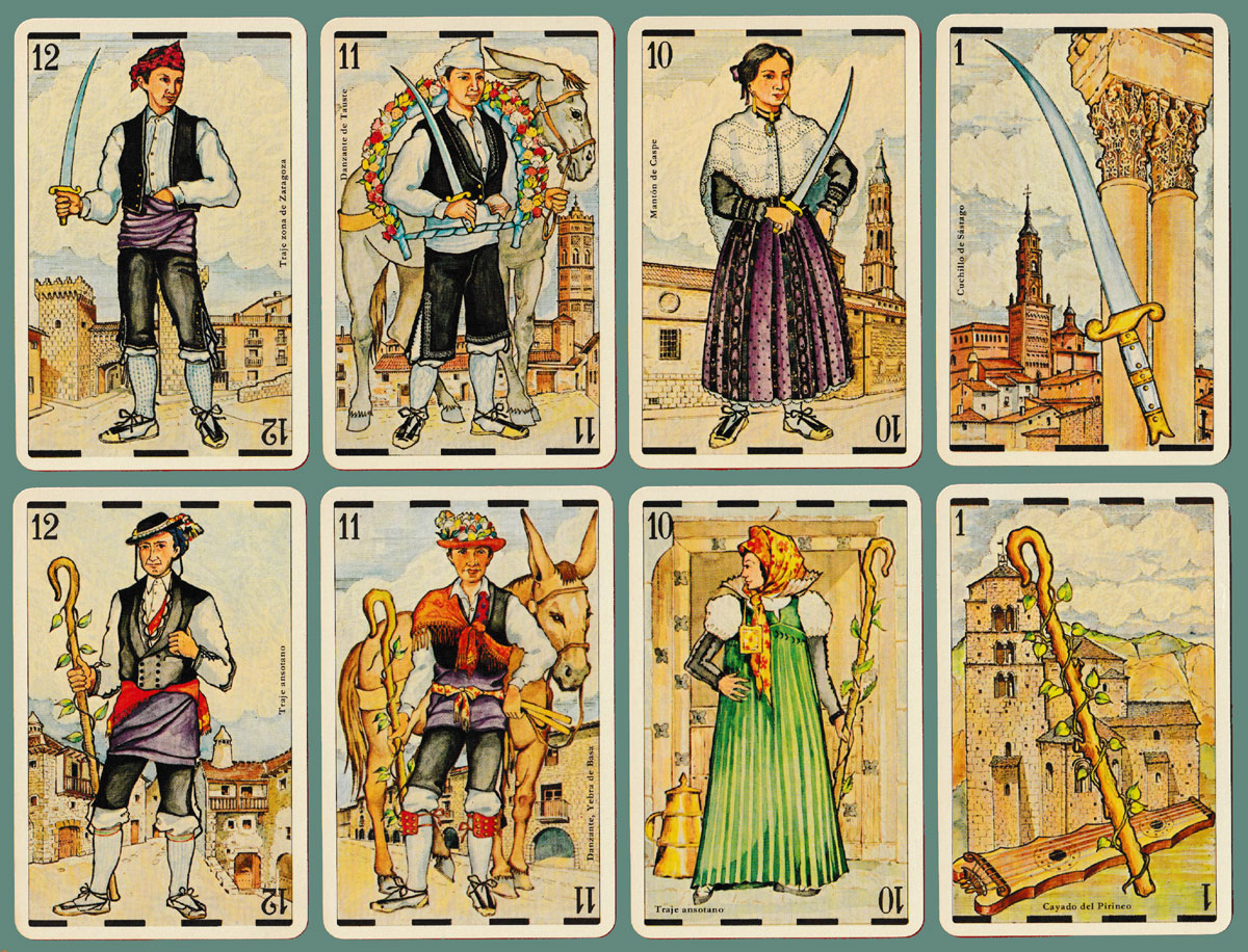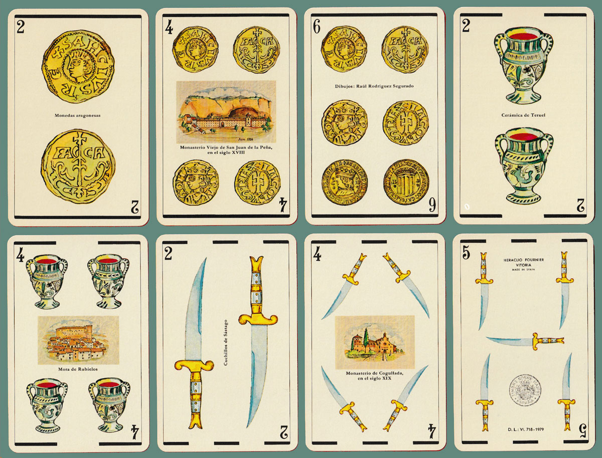 Above: Baraja Aragonesa made by Heraclio Fournier, S.A., Vitoria, for the Caja de Ahorros de Zaragoza, Aragón y Rioja, Spain, 1979. 48 cards + 2 extra cards in clear plastic box. Size: 61.5 x 95 mm.