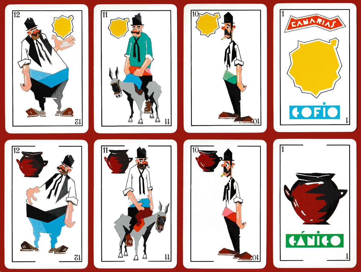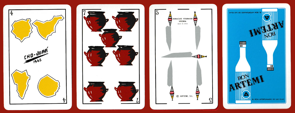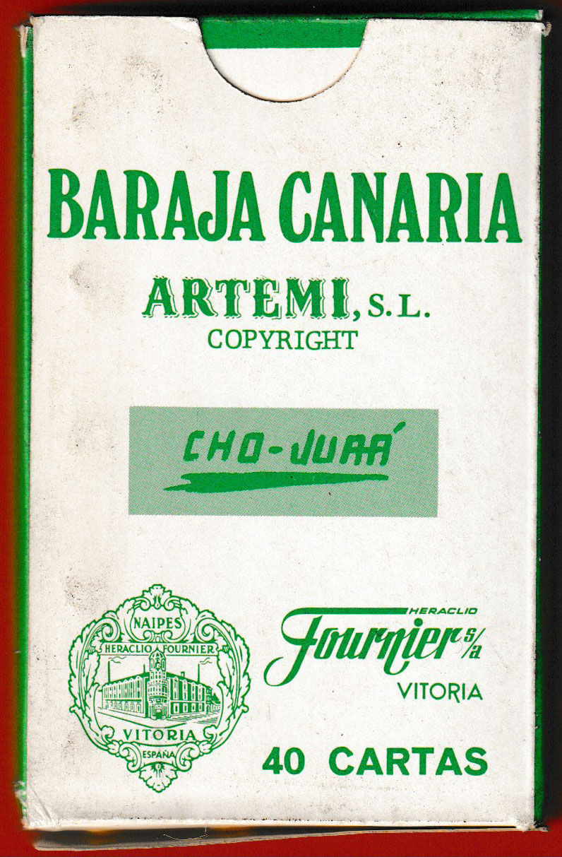 Above: Baraja Canaria printed by Heraclio Fournier, S.A., Vitoria, Spain, for Artemi, S.L., Gran Canaria, 1985. 40 cards in tuck box. Size: 61.5 x 95 mm. The back of the box merely reproduces the advertisement on the back of the cards.