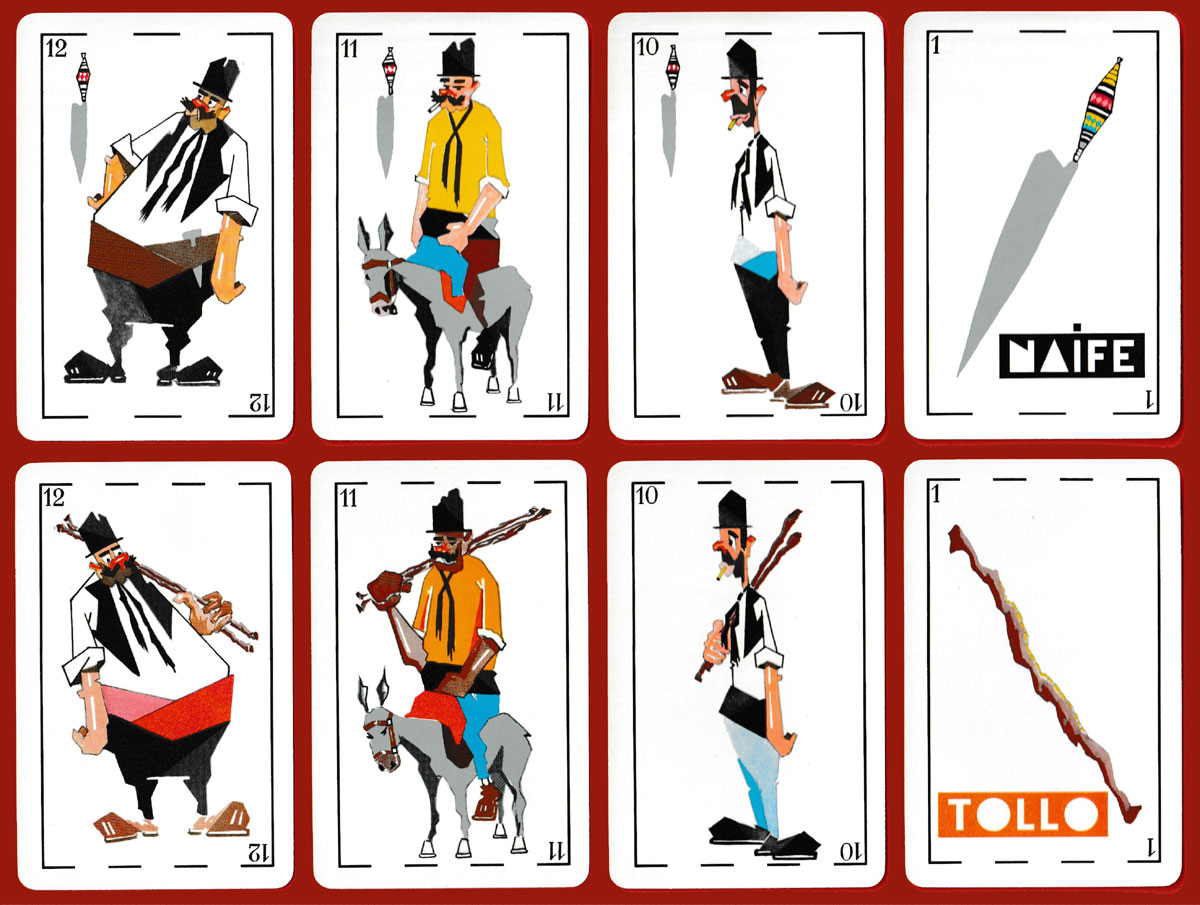 Millares Sall was the creator of the cartoon character Cho Juáa (written as Cho-Juaá on the 4 of Coins) who appears on all the Kings in this pack. Cho Juáa (Don Juan) has been described as the “typical village opportunist” of the Canary Islands. The angular designs are indeed comic, with the Knights riding donkeys and the Jacks looking distinctly miserable while smoking. All the courts have red noses. The non-standard suits are named on each Ace – gofio (local staple food shaped into maps of the islands), gánigo (clay pots), naife (Canarian knife), and tollo (sticks of dried shark meat). On the predominantly blue reverse is an advertisement for Artemi rum. See the box►