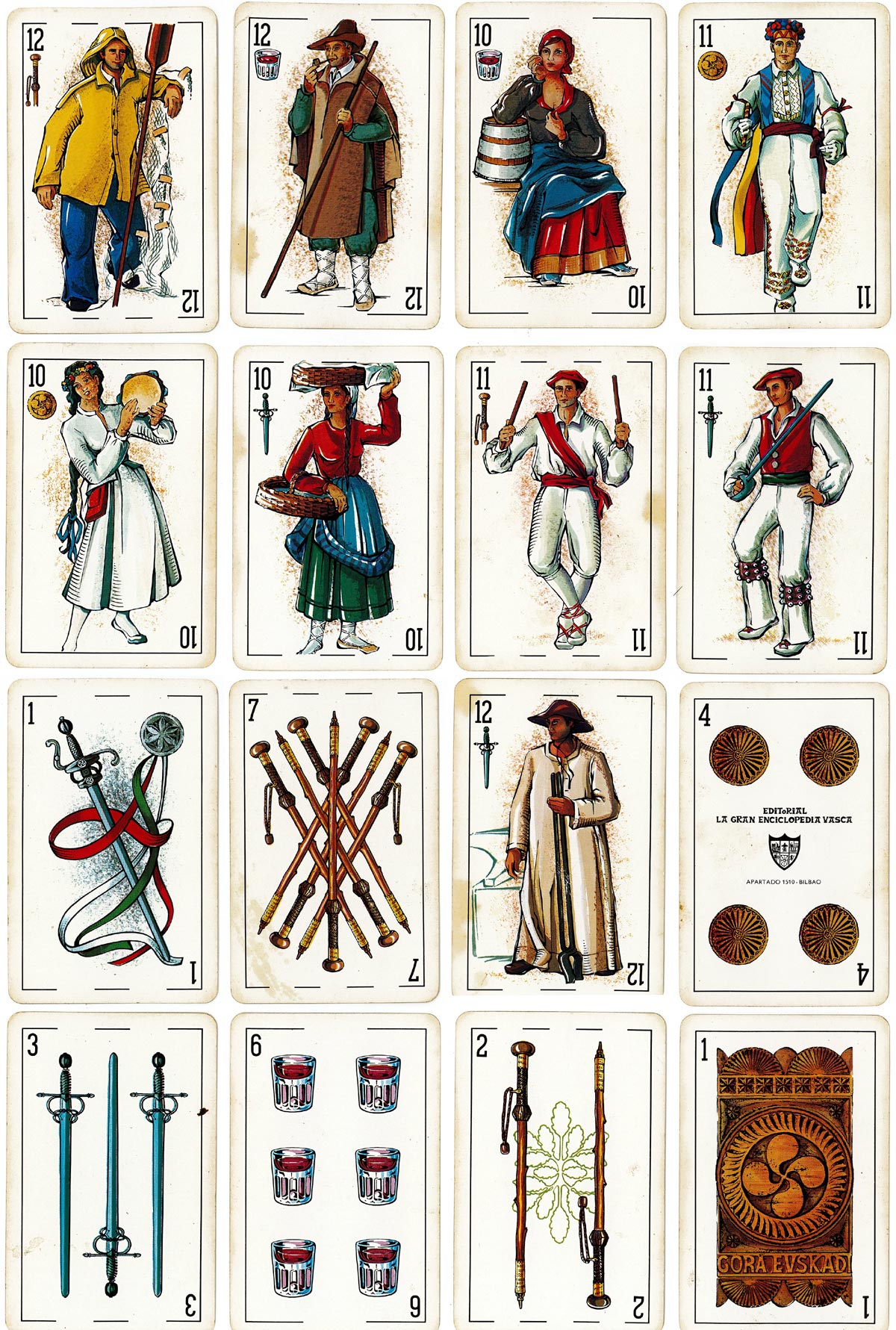 Above: Basque Country deck of 40 cards published by Fournier in 1979 for the Gran Enciclopedia Vasca y Diputación Foral de Álava. Presented in a sliding velvet case with gold engraving "Diputación Foral de Álava".