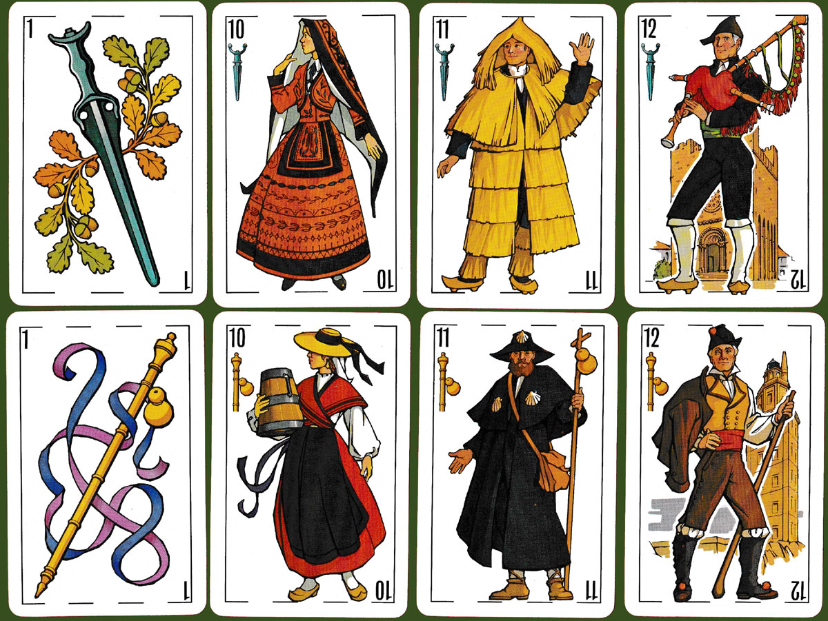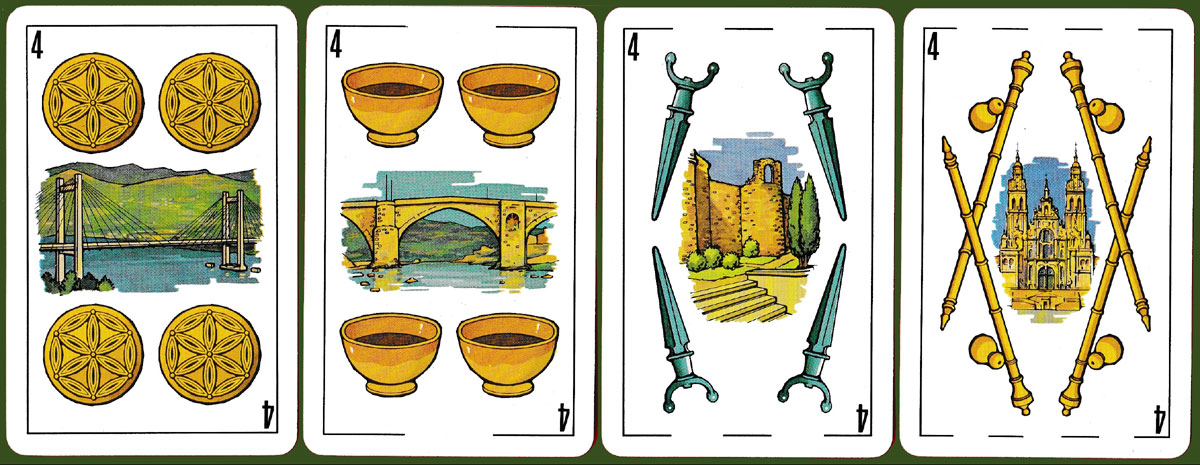 This Spanish Galician pack of 40 cards was published by Fournier in 1983. The suits are represented by coins from the period of the pre-Roman ‘Castros’ (early fortified settlements found particularly in Galicia), artisan cups, daggers, and the pilgrim's cane. Motifs from the four provinces of Galicia (La Coruña, Lugo, Orense and Pontevedra) are shown on the four of each suit, while the card backs display the coat-of-arms of each of the four provinces. The cards were designed by F. Perez Llamosas, and there is an explanatory leaflet by X.M. González Reboredo, author of Lendas galegas de tradición oral and also Guiìa de festas populares de Galicia. See the box►