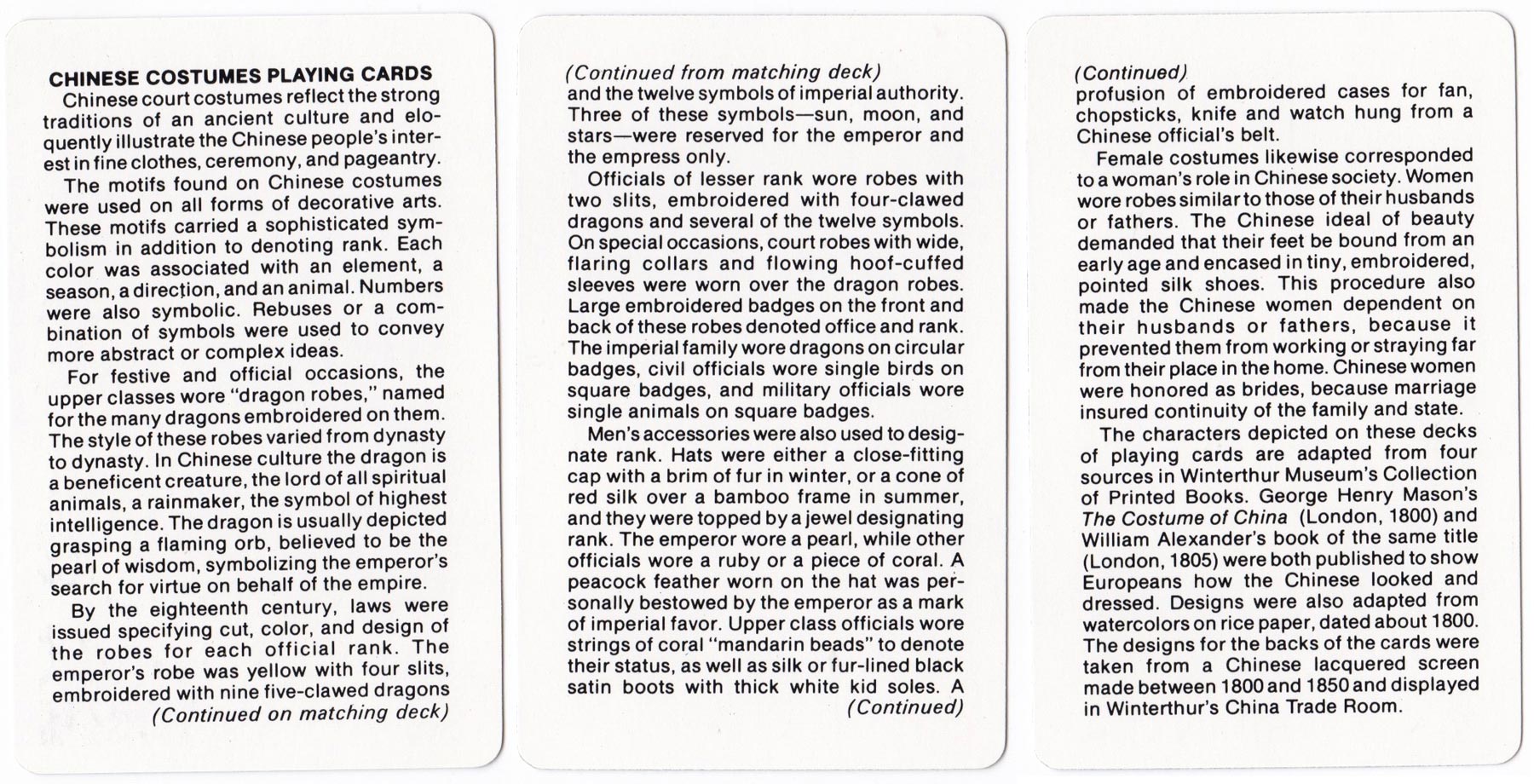 The Chinese Court Costumes on these playing cards are adapted from four sources in the Winterthur Collection of Printed Books, and were published by Fournier as a double boxed set in 1984. There is an interesting explanation of Chinese culture and symbolism on the Info Card►