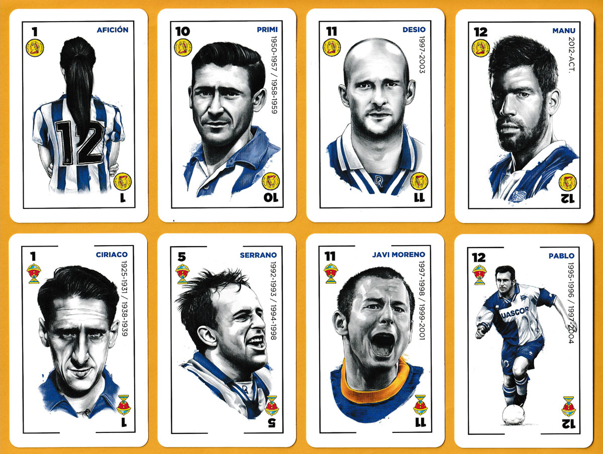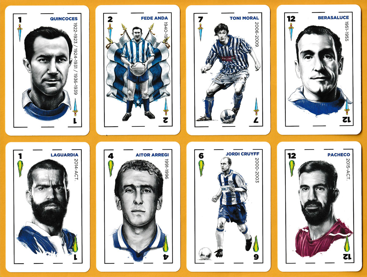 Deportivo Alavés (often simply called Alavés) is a Spanish football club based in Vitoria-Gasteiz. Although the club was founded in 1920, it celebrated its centenary on the 100th anniversary of the adoption of its current name (1921-2021). To mark the occasion, artist Guillem Bosch created this Spanish-suited pack with 40 black and white drawings of famous footballers who have played for the club. Each one is named top right alongside the dates that person was an active player. The team’s home kit is a blue and white-striped shirt and blue shorts. Fernando Pacheco (12 of Batons), who wears a crimson shirt, was a goalkeeper for the club. The tuck box is embossed in silver►
