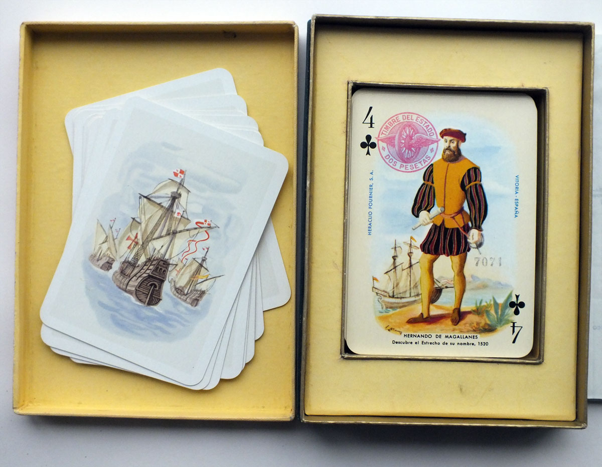 Above: Historical Playing Cards published by Heraclio Fournier, first edition 1952, designs by Ricardo Summers “Serny”. The four of clubs has a 2 Pesetas tax stamp. The 2 Jokers show a map of America. The reverse shows the three famous caravels “Santa María”, “Pinta” and “Niña”.