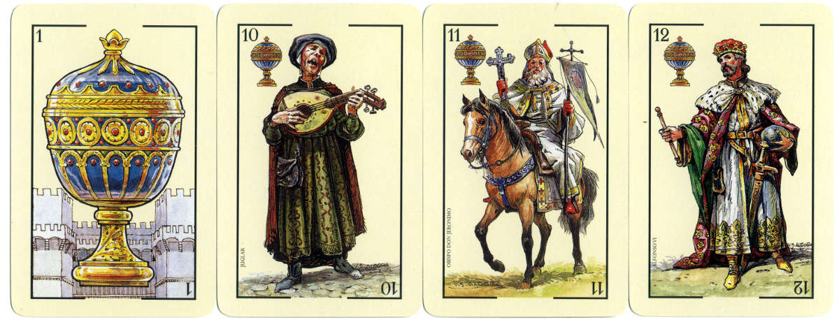 El Cid playing cards, commemorating the 9th centenary of the death of popular Spanish hero ‘El Cid Campeador’, were manufactured by Heraclio Fournier in 1999 for the Caja de Burgos. Playing cards have enjoyed great popularity in Spain for centuries, and the superb medieval artwork in this pack, by Vicente S. Algora, portrays historical persons on the court cards, with El Cid himself (Rodrigo Díaz de Vivar) dignified as the King of Coins. Alfonso VI is portrayed as the King of Cups, who rose to the throne after the death of his brother, Sancho II, who appears on the King of Swords. Pedro I of Aragon, a friend and ally of El Cid, appears on the King of Clubs. The four Cavaliers are nobles from the epic poem, and the ‘Sotas’ (Jacks or Infantry) are Christian and Muslim soldiers, with a minstrel on the Sota of Cups. The coin suit symbols also feature silhouette portraits of El Cid and his faithful wife Doña Jimena.