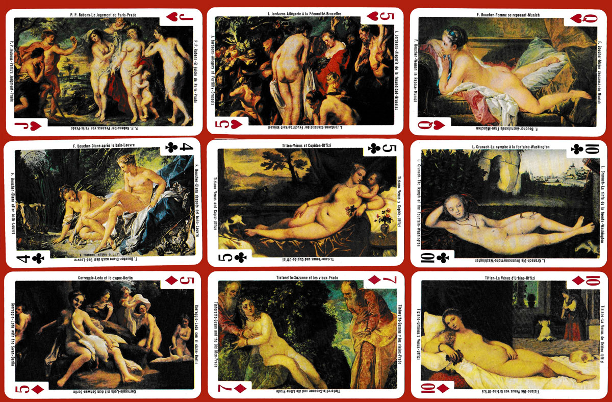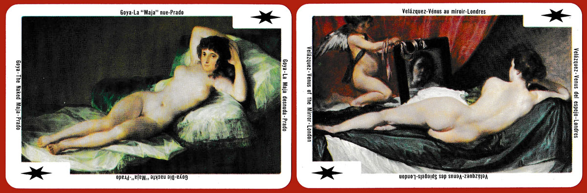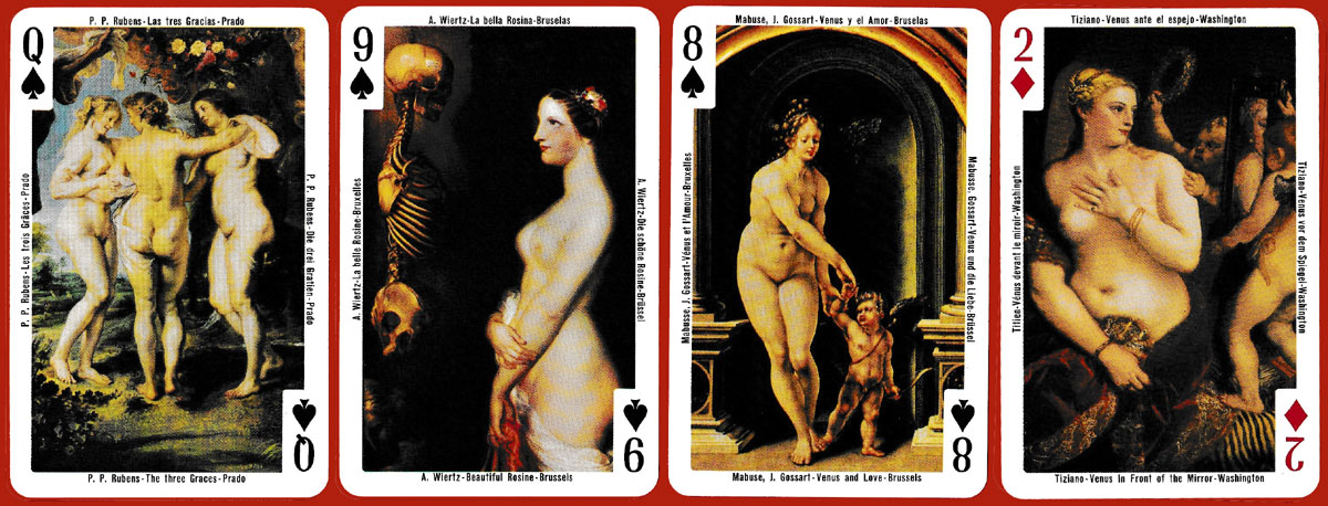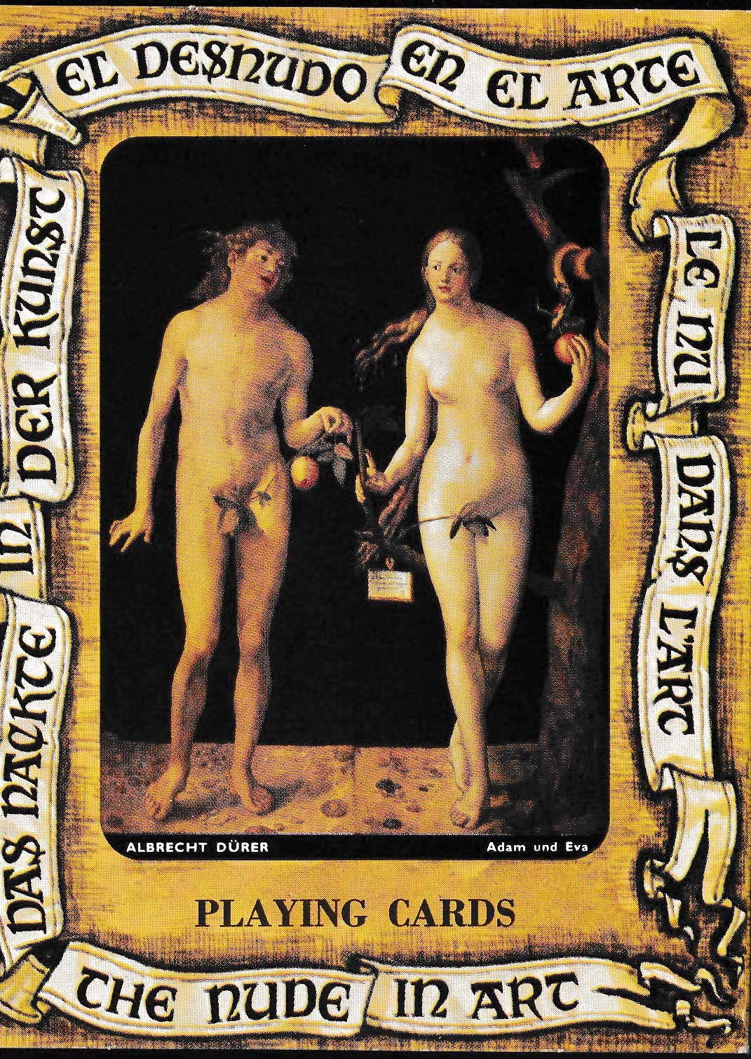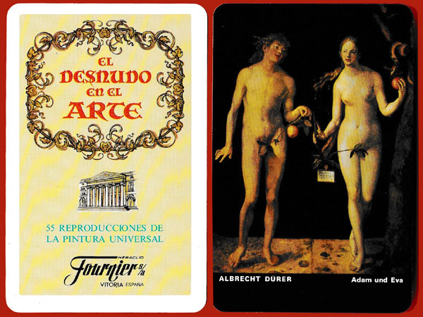 Published originally by Heraclio Fournier in 1977 this multi-lingual pack features famous paintings of nudes from the major museums of the world. Each card has the artist, title and location of the painting in four languages (English, Spanish, French and German). The backs of the cards show Durer’s “Adam and Eve,” currently housed in The Prado. The suit indices appear to differ slightly from the 1977 edition (see the entry in the Fournier Museum catalogue, p.98 no. 862) which suggests that this pack was possibly reprinted c. 1990. It contains 52 cards, two jokers, and 1 information card. See the box►