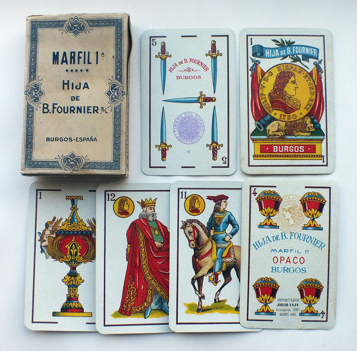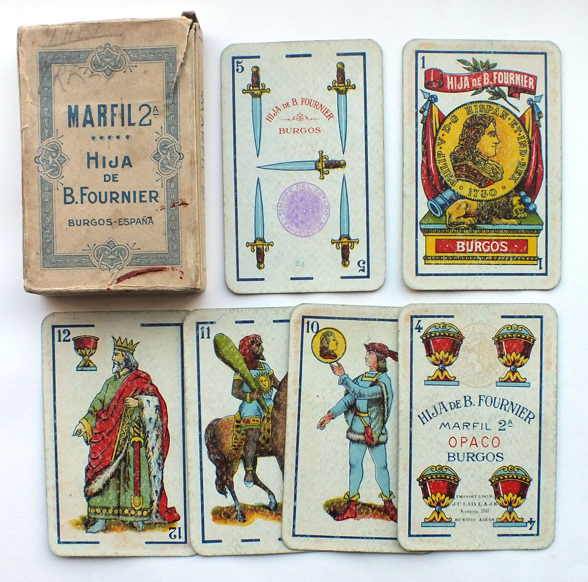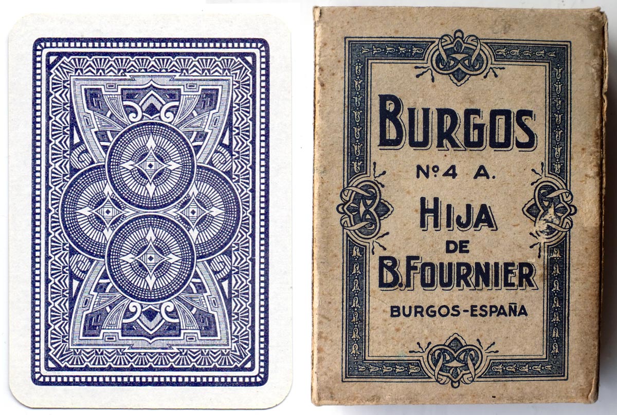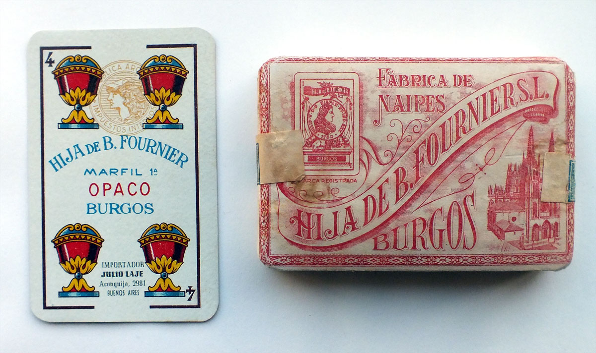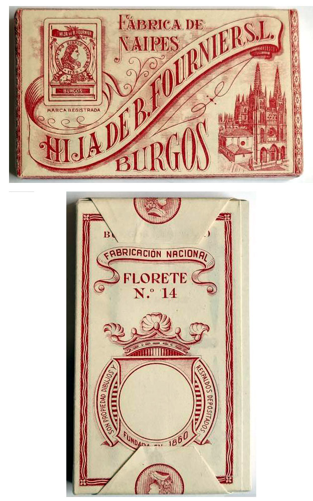 Having started out as Fournier Hermanos, Burgos in 1860, over time and as events unfolded, this branch of the company remained in the Fournier family undergoing several changes of name as it passed from generation to generation, finally becoming Hija de B. Fournier sometime around 1900. The factory remained in the original location where several types of playing cards continued to be produced (Spanish and English types) and also, for a short period during the Spanish Civil War, postage stamps were also produced. Playing Card brands include: Opaco 1ª; Marfil 1ª; Marfil 2ª; Florete; No.4 A; Poker Español & Poker No.52. The company was finally closed down in 1978.