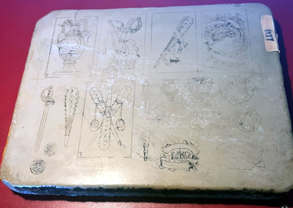 Piedra litográfica de la fábrica de naipes Heraclio Fournier. Los dibujos que se recogen corresponden a 5 cartas de la baraja España 370/nº inv. 43333 y otros dibujos aislados editada por Fournier en 1888. El museo de naipes certifica que procede de la fabrica al igual que varias similares que poseen en la cual aparece de la misma manera en un borde la etiqueta adhesiva numerada manualmente. Ha pertenecido siempre a la familia Fournier.