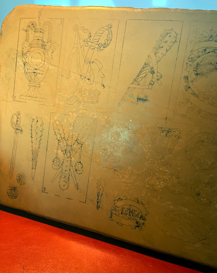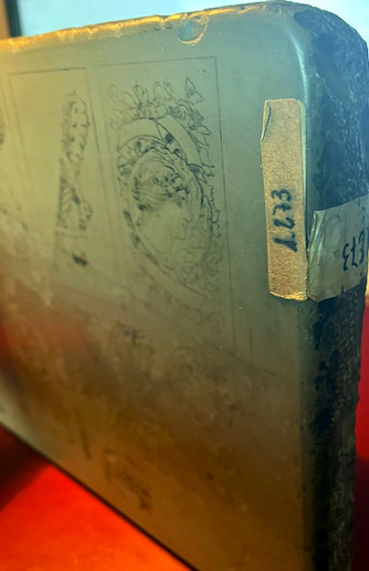 Lithographic stone from the Heraclio Fournier playing card factory. The images correspond to 5 cards from the deck ‘Spain 370/inv. 43333’ plus other related drawings published by Fournier in 1888. The playing card museum certifies that it comes from the factory, and is similar to several others in their possession, which have the manually numbered adhesive label on one edge. It has always belonged to the Fournier family.