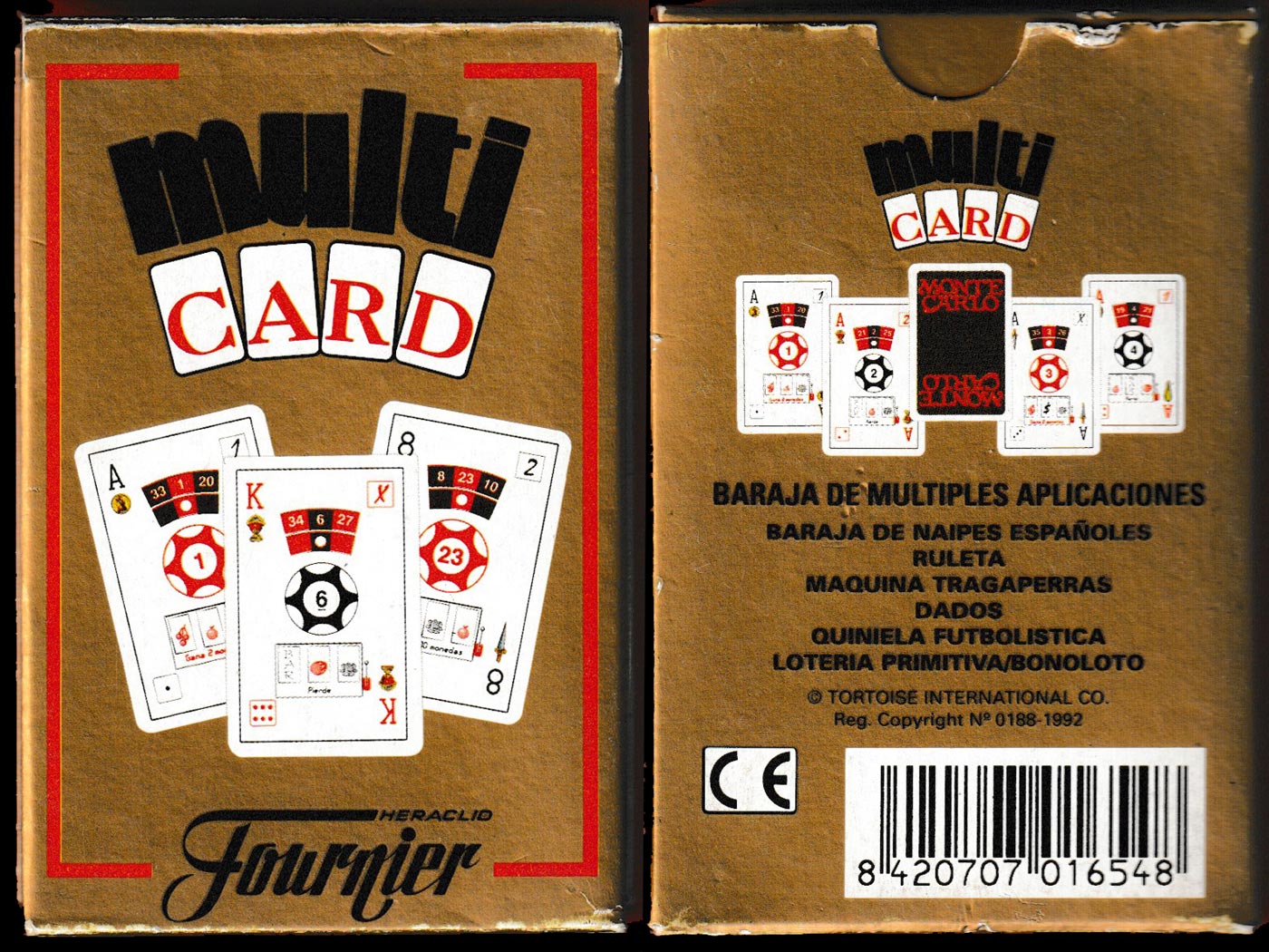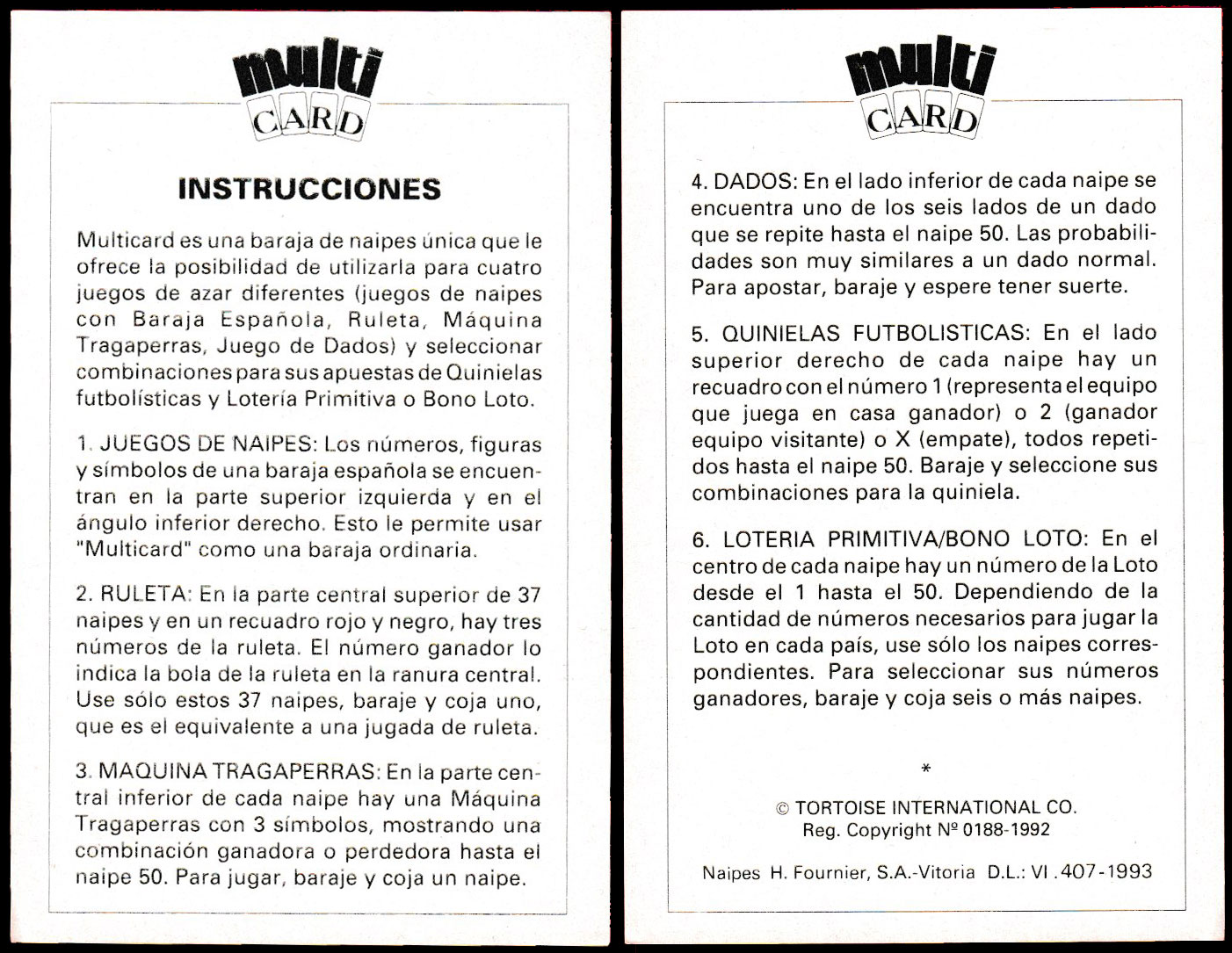 Above: ‘Multicard’ multipurpose playing cards made by Heraclio Fournier, S.A., Vitoria, Spain, 1993. 48 cards + 2 Jokers + instruction leaflet in Spanish, in tuck box. Size: 61.5 x 95 mm. © Tortoise International Co.