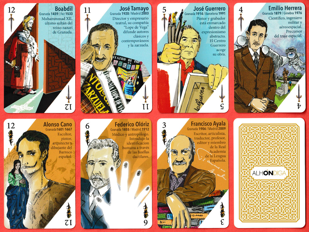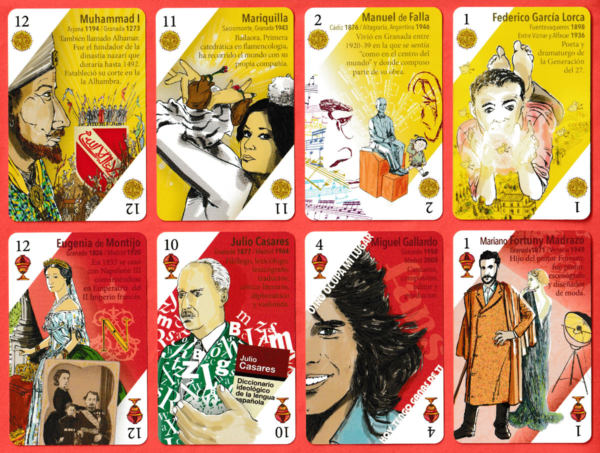 Forty famous men and women with links to Granada, on a pack designed by Rubén Garrido.