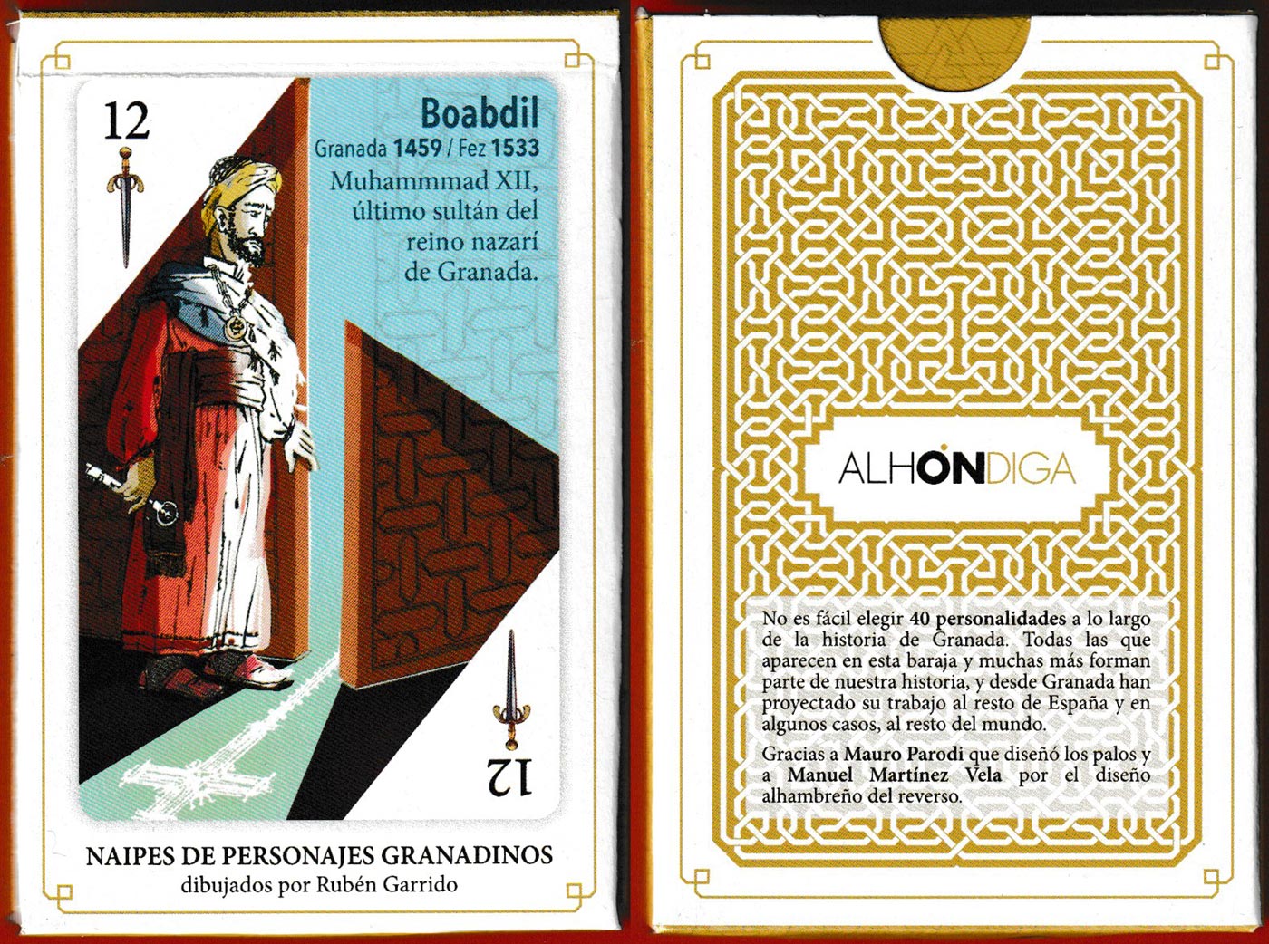Above: Naipes de Personajes Granadinos with designs by Rubén Garrido. Printed by Heraclio Fournier, S.A., Legutiano, Spain, 2023. 40 cards in tuck box. Size: 61.5 x 95 mm. Purchased in Granada, December 2023.
