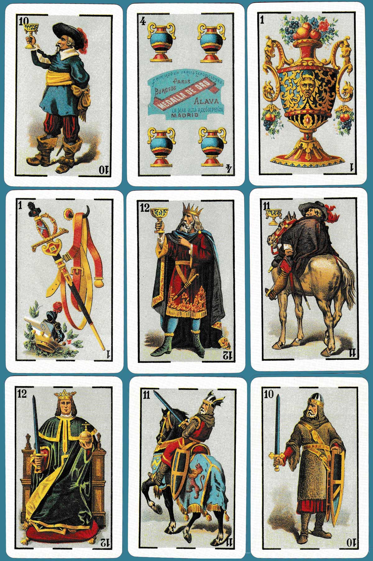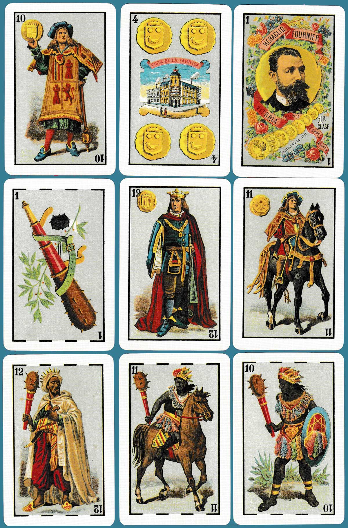 This pack of 40 lithographed cards was originally produced by Heraclio Fournier in 1888 after the construction of his factory in 1887 (which appears on the 4 of coins). It was the first pack bearing a portrait of Fournier himself (on the ace of coins) and won the 1889 Paris Exhibition Prize. See the box►