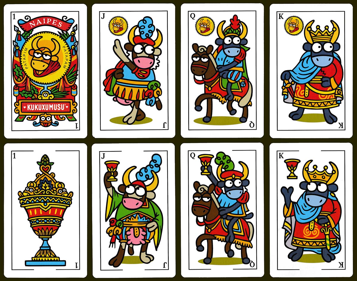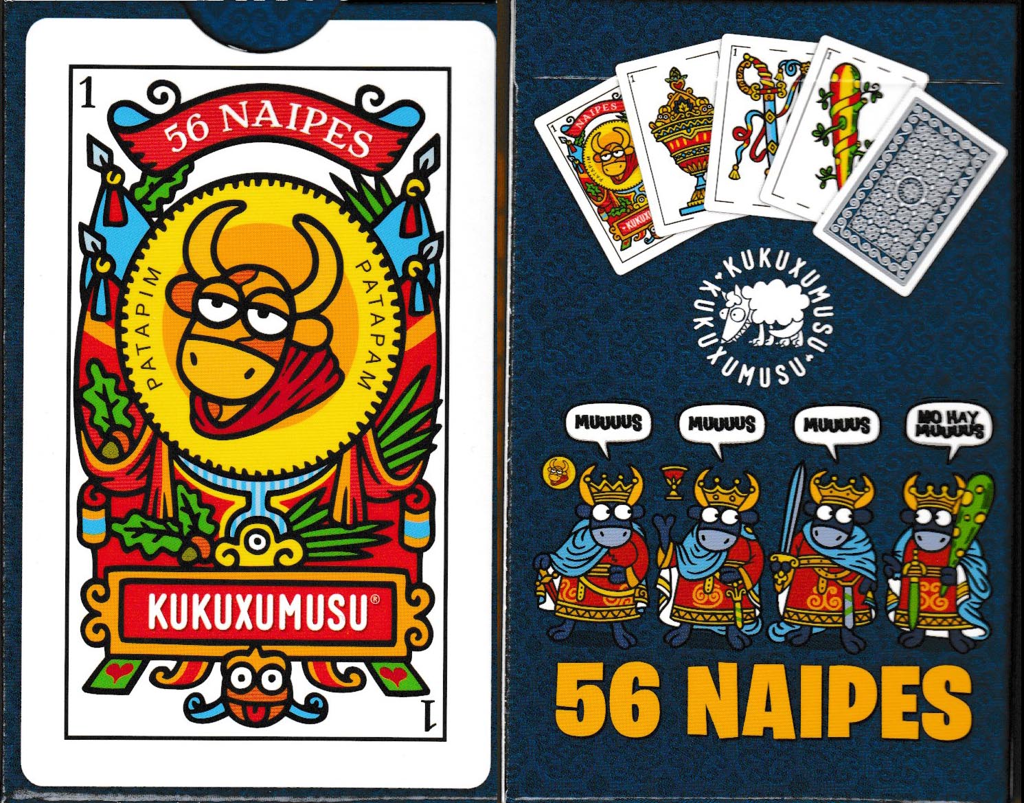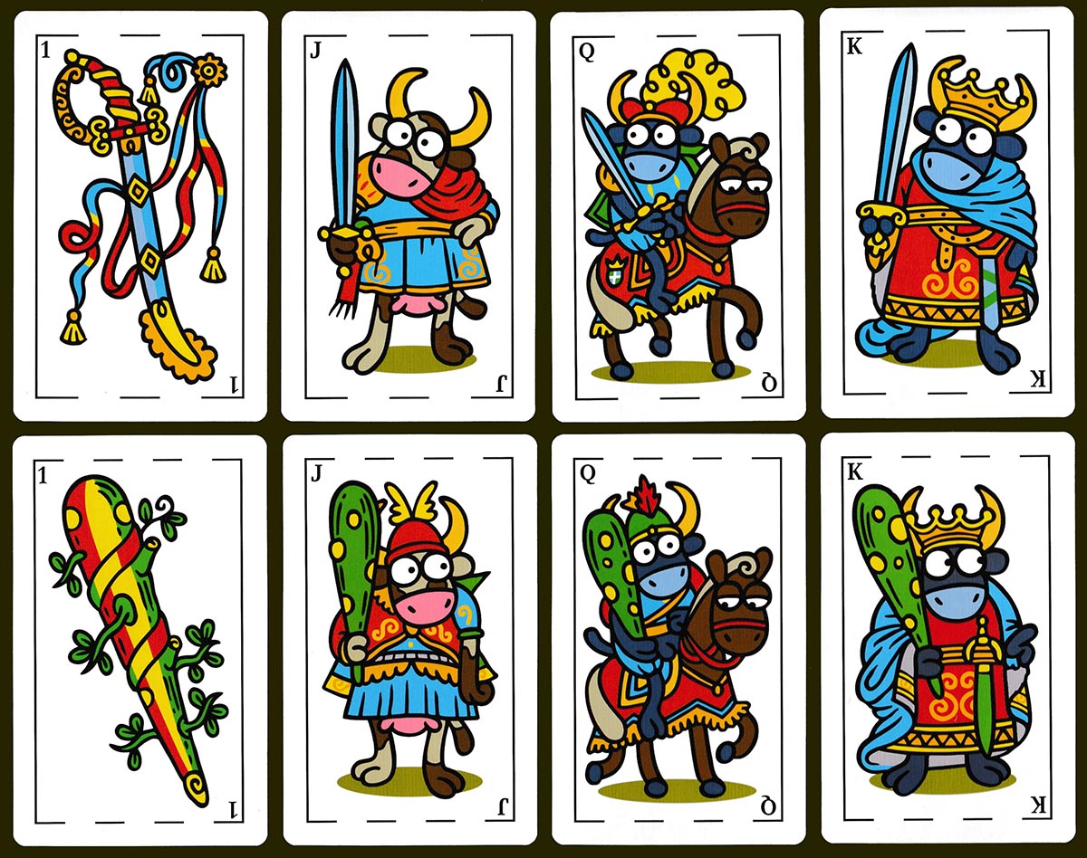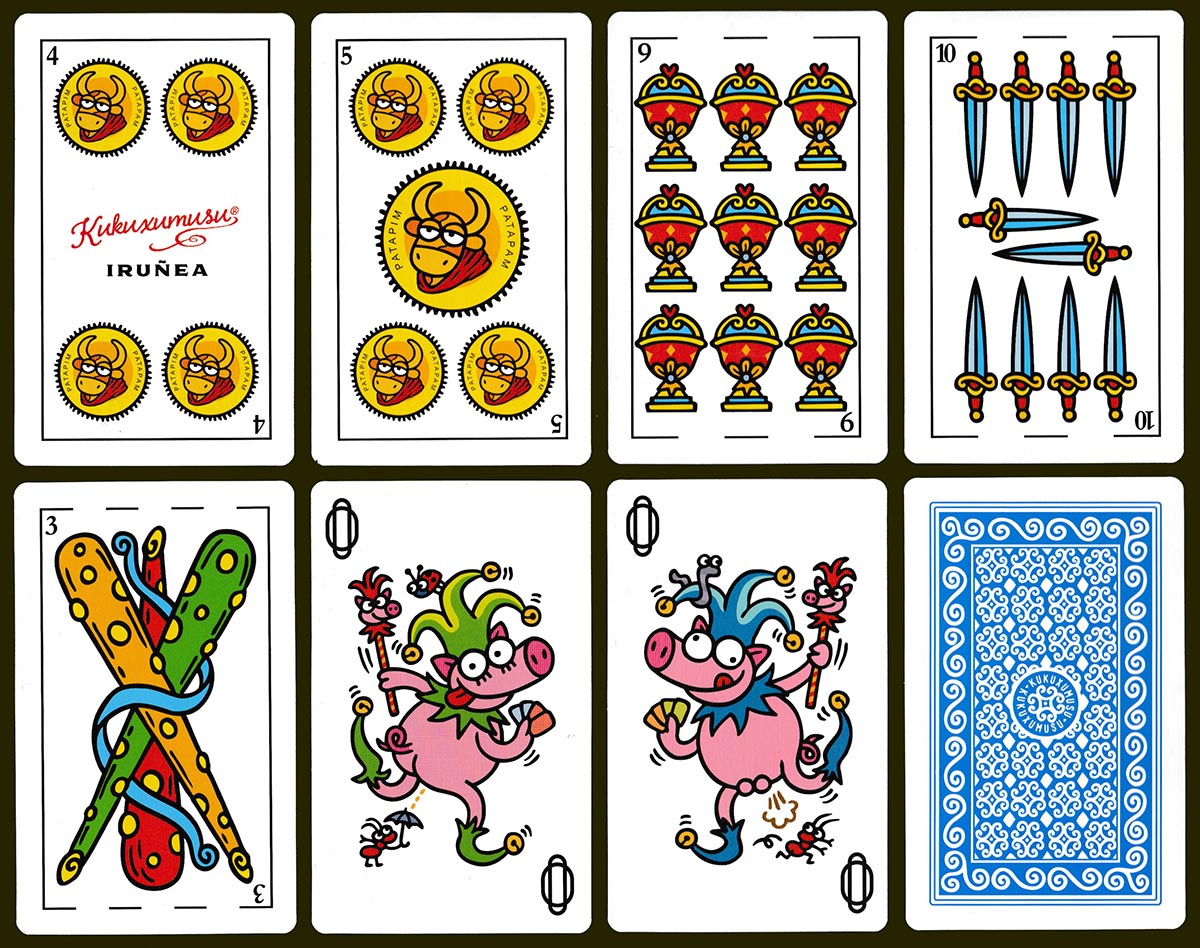 Kukuxumusu (or Ataute, S.L.) is a Spanish company from Pamplona, specialising in clothing and product design. The name means ‘flea kiss’ in Basque. The company was founded in 1989, making T-shirts featuring bull-running and bullfights, hence the colourful and humorous bulls on the court cards in this pack. On the Jokers are playful pink pigs. It is unusual for a Spanish-suited pack to have 52 cards and equally unusual for it to have English indices.