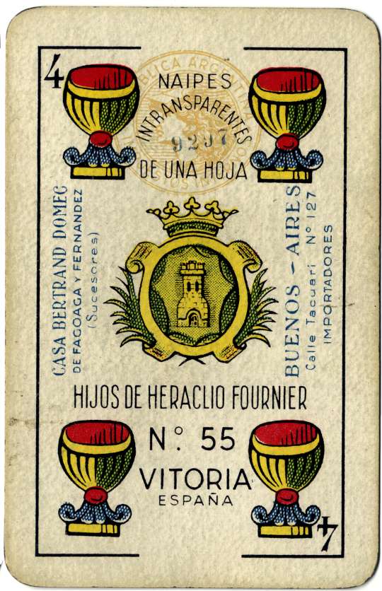 A popular version of the Spanish Catalan pattern based on the designs of Guarro which were acquired by Fournier in 1930. The Four of Cups has a tower motif in the centre (Coat of Arms of Vitoria-Gasteiz), along with texts which read: Naipes Intransparentes de Una Hoja - Hijos de Heraclio Fournier - No.55 - Vitoria. The Ace of Swords has a small Barcelona coat-of-arms at the centre and the Ace of Coins features a head wearing an armoured helmet along with the symbols of maritime power and commerce resting on a plinth. This version of the Spanish Catalan pattern has also been used in South America.