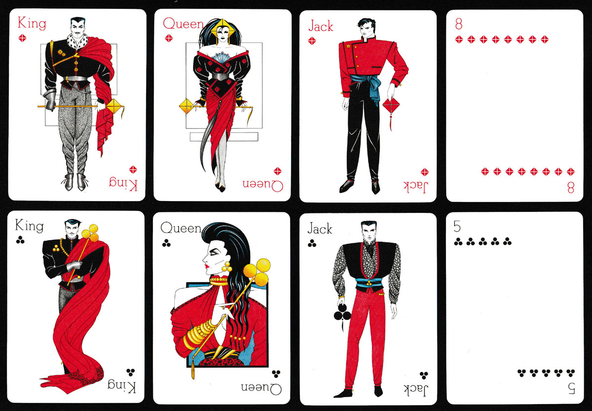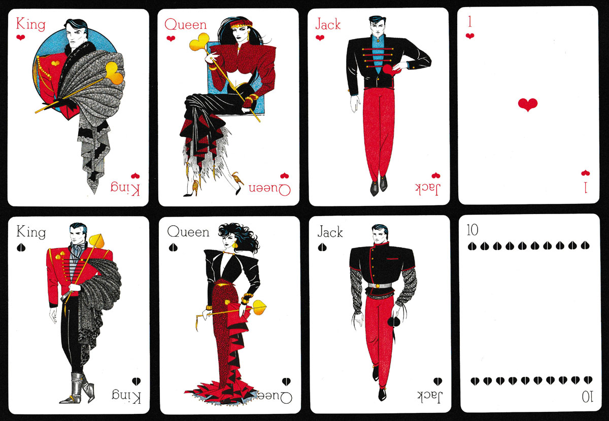 Leather goods and accessories are Paco Lobo’s stock-in-trade. That much is clear from his highly original and striking designs featuring drawings of fashion models in 1980’s gear. The colours red and black predominate. The names of the court cards are spelt out in full in English and poker inglés appears on the title card. For the pips, both a non-standard design and a non-standard arrangement have been adopted, leaving much of each card blank. The Joker design, too, is strong and bold. Alberto Cabornero and Juan Berrio are named on the title card as collaborators on this project.