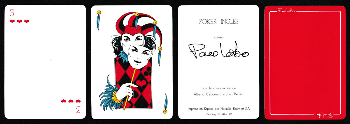 Above: Paco Lobo playing cards made by Heraclio Fournier, S.A., Vitoria, Spain, for Paco Lobo, 1985. 52 cards + 2 (identical) Jokers + 1 title card in clear plastic box. Size: 63 x 88 mm.